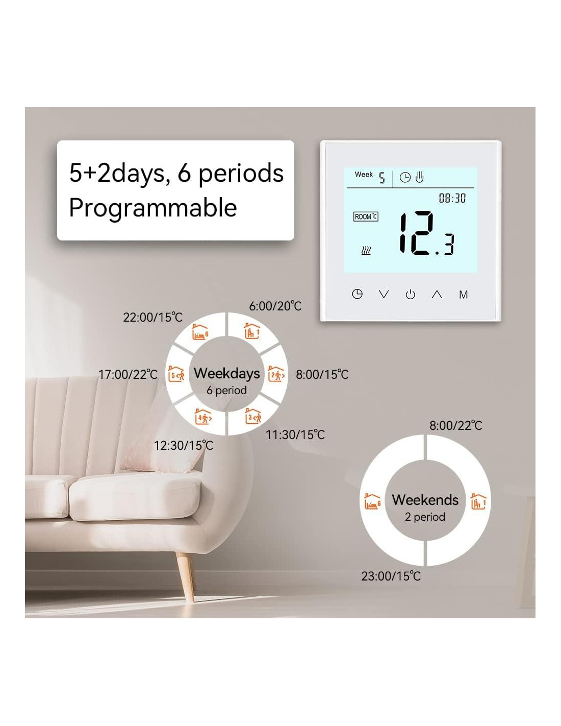 - Programable: Soporta 5+2, 6+1 y 7 días programables semanalmente, seis períodos programables, controlando la configuración de temperatura.