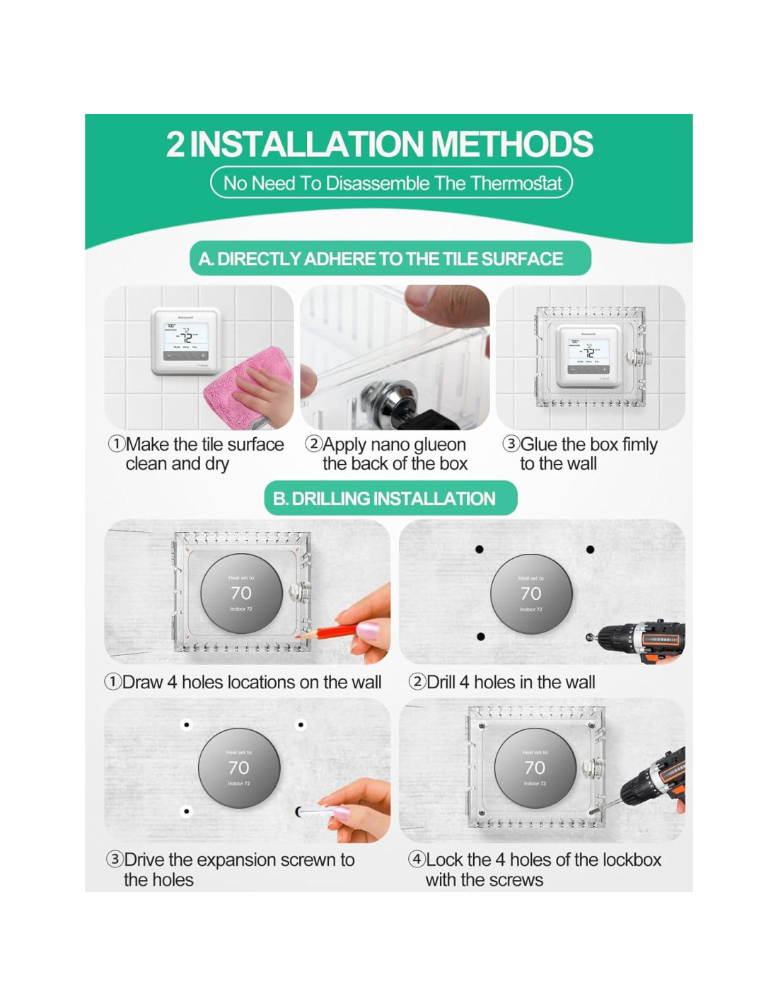 - Instalación sin tornillos: Nuestra cubierta de termostato con cerradura y llave en el conjunto proporciona dos métodos de instalación, A-Pegar directamente en la pared limpia y lisa con pegamento nano, B- Perforar agujeros para la instalación. Y no necesita quitar el termostato de la pared.