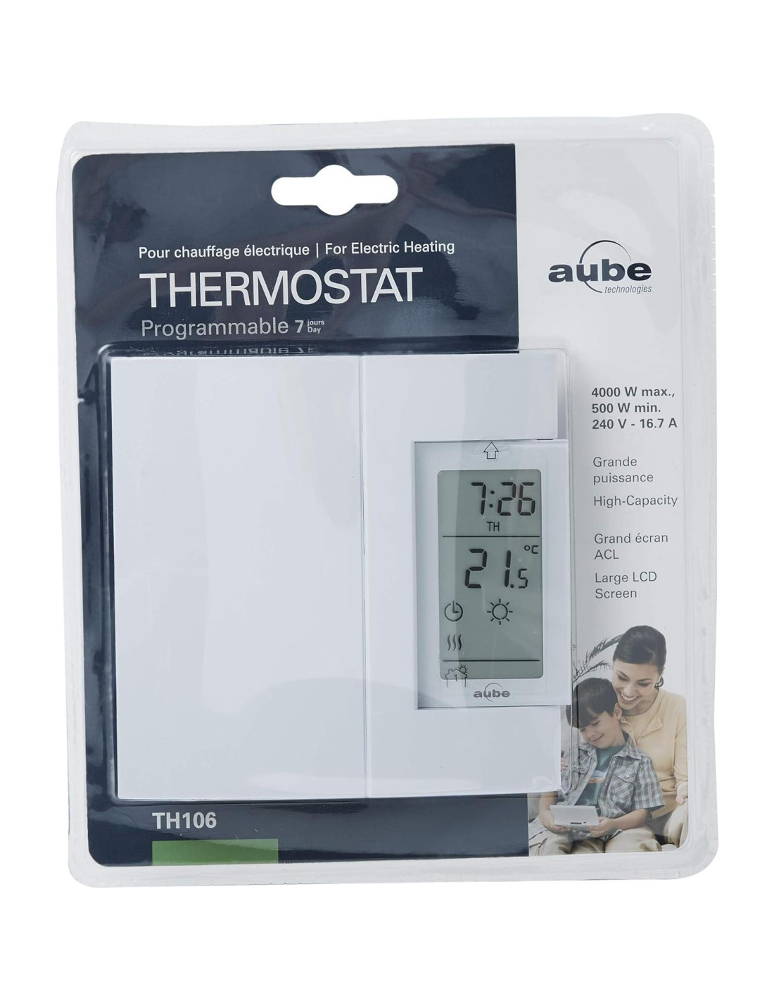 Descripción del Producto Este Aube por Honeywell Home termostato electrónico de calefacción de alta capacidad (hasta 4000 W @ 240 V) con conmutación TRIAC combina una precisión inigualable y un funcionamiento silencioso. La conmutación TRIAC es 100% silenciosa, lo que lo hace ideal para dormitorios y tiene un control de temperatura sin igual. Control de temperatura definitivo: el tipo de termostato más preciso en el mercado (+/- 0.15 Grados Celsius y 0.27 Grados Fahrenheit). El indicador de potencia de calefacción en pantalla proporciona verificación instantánea de la potencia utilizada. La conexión de 2 hilos no polarizada significa una instalación rápida y sin complicaciones. La programación de 7 días proporciona opciones de programación separadas para cada día de la semana (4 períodos por día); horario preprogramado o personalizado. La función de Inicio Temprano asegura que la temperatura programada se alcance a la hora programada. Del Fabricante Este Aube por Honeywell termostato electrónico de calefacción de alta capacidad con conmutación TRIAC combina una precisión inigualable y un funcionamiento silencioso. La conmutación TRIAC es 100% silenciosa, lo que lo hace ideal para dormitorios y tiene un control de temperatura sin igual. Control de temperatura definitivo: el tipo de termostato más preciso en el mercado (+/- 0.15 Grados Celsius y 0.27 Grados Fahrenheit). El indicador de potencia de calefacción en pantalla proporciona verificación instantánea de la potencia utilizada. La conexión de 2 hilos no polarizada significa una instalación rápida y sin complicaciones. La programación de 7 días proporciona opciones de programación separadas para cada día de la semana (4 períodos por día); horario preprogramado o personalizado. La función de Inicio Temprano asegura que la temperatura programada se alcance a la hora programada.