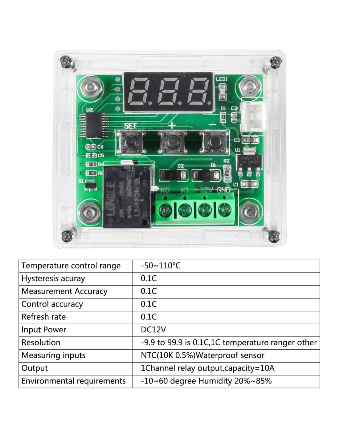 - [Parámetro del Controlador de Temperatura W1209] Rango de temperatura: -50-110C; Precisión de control: 0.1 Celsius. Potencia de entrada (CC): 12V; Entradas de medición: NTC (10K 0.5%); Sensor impermeable: 0.5M; Salida: salida de relé de 1 canal, capacidad: 10A; Consumo de energía: Corriente estática: 35mA; Corriente: 65mA.