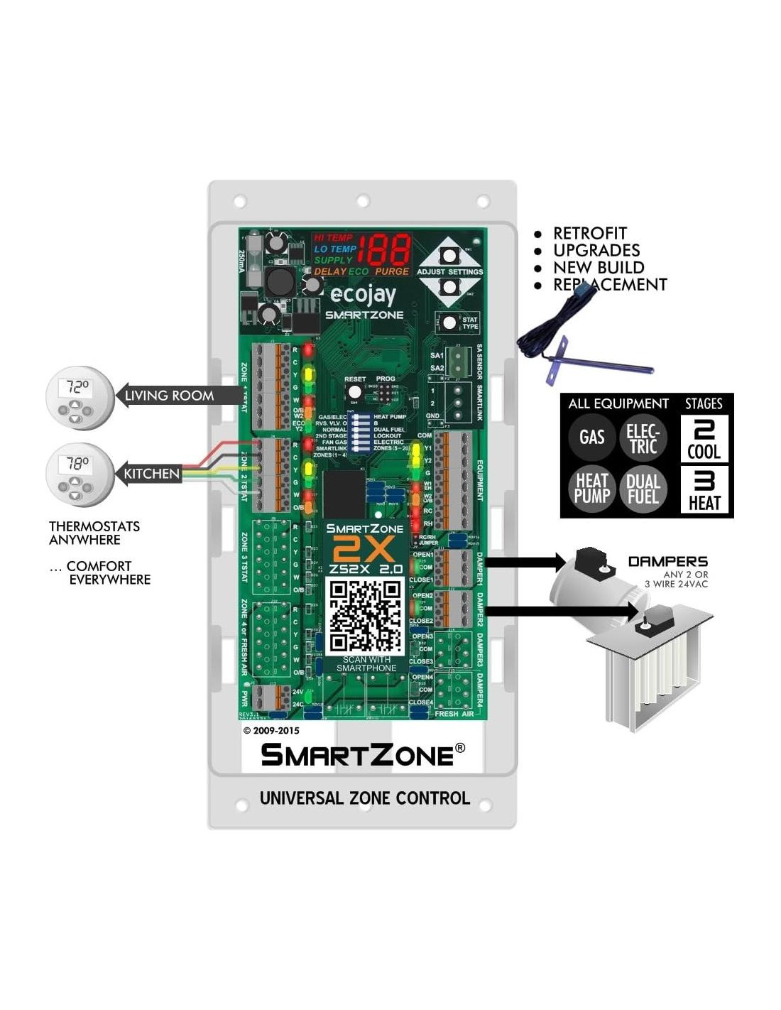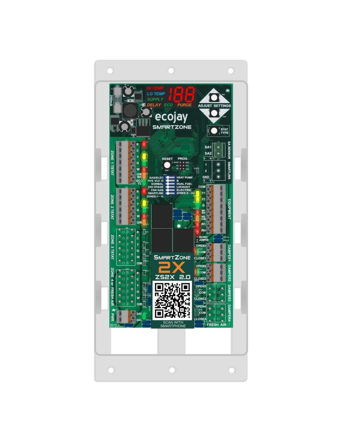 Los Controladores de Zonificación residenciales y comerciales ligeros ECOJAY SmartZone son fácilmente configurables para satisfacer una amplia gama de requisitos de aplicación y equipo. La instalación y configuración simples hacen que SmartZone sea perfecto para CAMBIO, RETROFIT, NUEVA INSTALACIÓN y MEJORAS. La PANTALLA DIGITAL LED iluminada proporciona información completa sobre el estado del sistema y la temperatura del sensor de suministro incluido. Los LED codificados por colores en todos los conectores de cableado simplifican la solución de problemas. SmartZone maximiza la eficiencia y protección del equipo con controles de escalonamiento de 'Tiempo y Temperatura' integrados. La compatibilidad universal significa que SmartZone funciona con todos los tipos de equipos, termostatos y compuertas. Características exclusivas que ahorran tiempo, como aire fresco y terminales de inserción, hacen de SmartZone la elección inteligente. No solo es SmartZone el más fácil de instalar, si tienes algún problema o pregunta... ECOJAY tiene el mejor soporte técnico por teléfono y en línea. Simplemente visita el sitio web y llámalos o envíales un correo electrónico para una experiencia rápida y útil. ZoningSupply también ofrece excelentes recursos en línea y una línea directa técnica donde puedes obtener toda la ayuda que necesitas para tu próximo proyecto de zonificación HVAC.