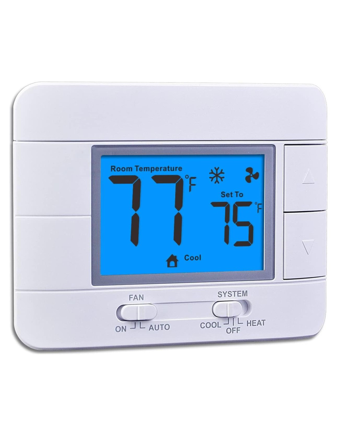 el termostato de etapa única tiene una pantalla retroiluminada grande y fácil de leer, que te permite ver claramente lo que estás haciendo para una operación más fácil. Además, este termostato mejorado cuenta con una pantalla de ciclo de temperatura y humedad en tiempo real. Nos especializamos en el diseño y fabricación de productos de grado profesional que mejoran la comodidad de un hogar y simplifican la instalación. hornos de gas, aceite o eléctricos, sistema de milivoltios, sistema de calefacción y refrigeración central. (No seguir estas instrucciones podría causar daños materiales graves) - No programable - Etapa única - 1 Calor, 1 Frío - Pantalla LCD grande con retroiluminación azul - Monitor de temperatura y humedad de la habitación - Interruptor de ventilador con funciones ON y AUTO - Compartimento de batería de fácil acceso - Indicador de batería baja - Configurable eléctrico o de gas - Terminales B y O separados - Ajustes de oscilación de calefacción y refrigeración separados (tasa de ciclo) - Ajuste de calibración de temperatura de la habitación - Protección de retraso del compresor de 3 minutos (seleccionable encendido o apagado) - Opciones de visualización: visualización de temperatura en Fahrenheit o Celsius - Bloques de terminales codificados por colores fáciles de usar - Designaciones de terminales RH, RC, G, Y, C, O, B, W - Sub-base universal - Montaje en pared o caja de conexión - Alimentación dual por 24VAC o 2 baterías AAA 1 x Termostato no programable; 1 x Manual de Instalación; 1 x Etiqueta de Cable; 2 x Tornillos y Anclajes