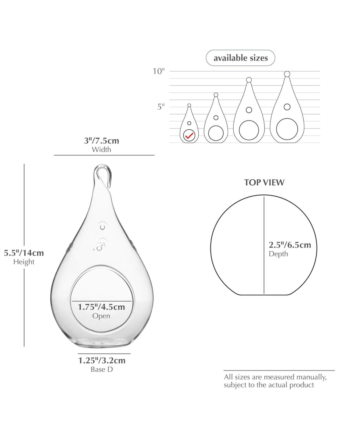 WGV ha tomado artículos cotidianos y les ha dado vida! Estos espacios de jardín vivos son del tamaño y forma perfectos para almacenar tu jardín secreto privado. Elige entre una Bombilla, Cápsula de Linterna, Pera o una Gota (todos vienen en tamaños pequeño, mediano y grande) estos artículos cotidianos más grandes que la vida sorprenderán a tus invitados! Cultiva tus suculentas, plantas de aire, musgo, o crea una divertida escena de playa, jardín, jungla o Zen usando arena y figuritas! WGV incluso ha presentado algunos con bases redondeadas que son únicamente para colgar y algunos con bases planas que pueden duplicarse como un adorno de jarrón de mesa, mesa de café o mesita de noche. Tamaños disponibles Gota: [HCH0205 - 3" (7.62 cm) W, 5.5" (13.97 cm) H] [HCH0207 - 3.5" (8.89 cm) W, 7" (17.78 cm) H] [HCH0209] - 4" (10.16 cm) W, 9.25" (23.50 cm) H] [HCH0210 - 4.75" (12.07 cm) W, 9.5" (24.13 cm) H] Linterna: [HCH0506 - 5" (12.70 cm) W, 6" (15.24 cm) H] [HCH0508 - 5" (12.70 cm) W, 8" (20.32 cm) H] [HCH0512 - 5" (12.70 cm) W, 12" (30.48 cm) H] [HCH0513 - 5" (12.70 cm) W, 13" (33.02 cm) H] Bombilla: [HCH0606 - 3" (7.62 cm) W, 6" (15.24 cm) H] [HCH0607 - 3.5" (8.89 cm) W, 7" (17.78 cm) H] [HCH0608 - 4.25" (10.80 cm) W, 8.25" (20.96 cm) H] Empaque profesional: Tu experiencia siempre es nuestra prioridad. Los jarrones de vidrio son productos frágiles, por favor trátalos con cuidado al instalarlos. Nota: Si recibes un artículo roto, no se considera defectuoso. Por favor contacta a nuestra oficina inmediatamente para un reemplazo o reembolso. No es necesario devolver los jarrones rotos, simplemente envíanos una foto. Los jarrones rotos no son defectuosos; son causados por daños del transportista durante el tránsito. Por favor no lo reportes en Amazon como defectuoso, ya que Amazon puede confundir entre daño por envío y defectuosidad del producto.