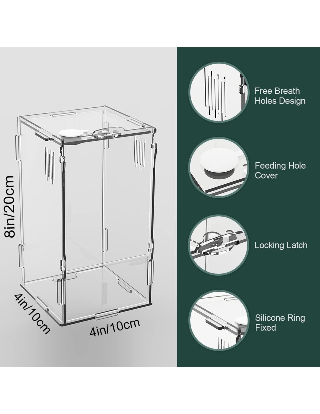 El pestillo de seguridad rotatable puede prevenir efectivamente que las mascotas escapen y causen lesiones, para así proteger mejor la seguridad de las mascotas. Abre la parte superior para tocar a tu mascota, ¡haciendo más conveniente interactuar con tu mascota! Puedes observar claramente la encantadora vida diaria de las mascotas a través de la caja de cría. ¿Cuál es el tamaño? Nuestro terrario acrílico tiene dos tamaños: 20.32cm x 15.24cm x 35.56cm y 10.16cm x 10.16cm x 20.32cm. ¿Es de apertura superior o apertura frontal? Las cajas colocadas verticalmente se abren por el frente, y las cajas colocadas horizontalmente se abren por la parte superior. ¿Es el acrílico transparente? Sí. Por favor, quita la película protectora para una visión clara y transparente. ¿Es fácil para las mascotas escapar de la caja de alimentación? No. El pestillo de seguridad rotatable puede prevenir efectivamente que las mascotas escapen. ¿Son las pequeñas rendijas suficientes para la ventilación de un recinto bioactivo para arañas? Sí. Adecuado para tarantulas, pequeñas tortugas, caracoles, escarabajos, arañas, grillos, mantis, lagartija doméstica, camaleón, gecko, escorpiones y otros reptiles e insectos.