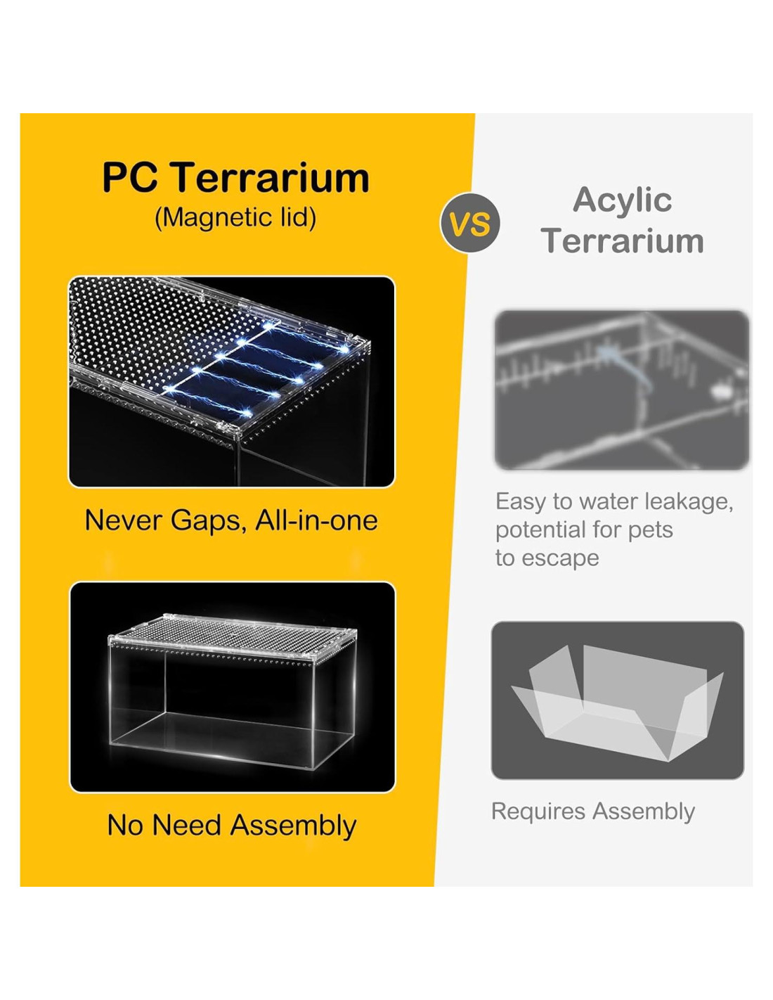 - Nunca roto: Fabricado con PC templado de alta dureza, este tanque para reptiles garantiza durabilidad y seguridad. El material resiste tanto la rotura como el amarillamiento, proporcionando protección duradera para mascotas como lagartos, geckos y tarántulas.