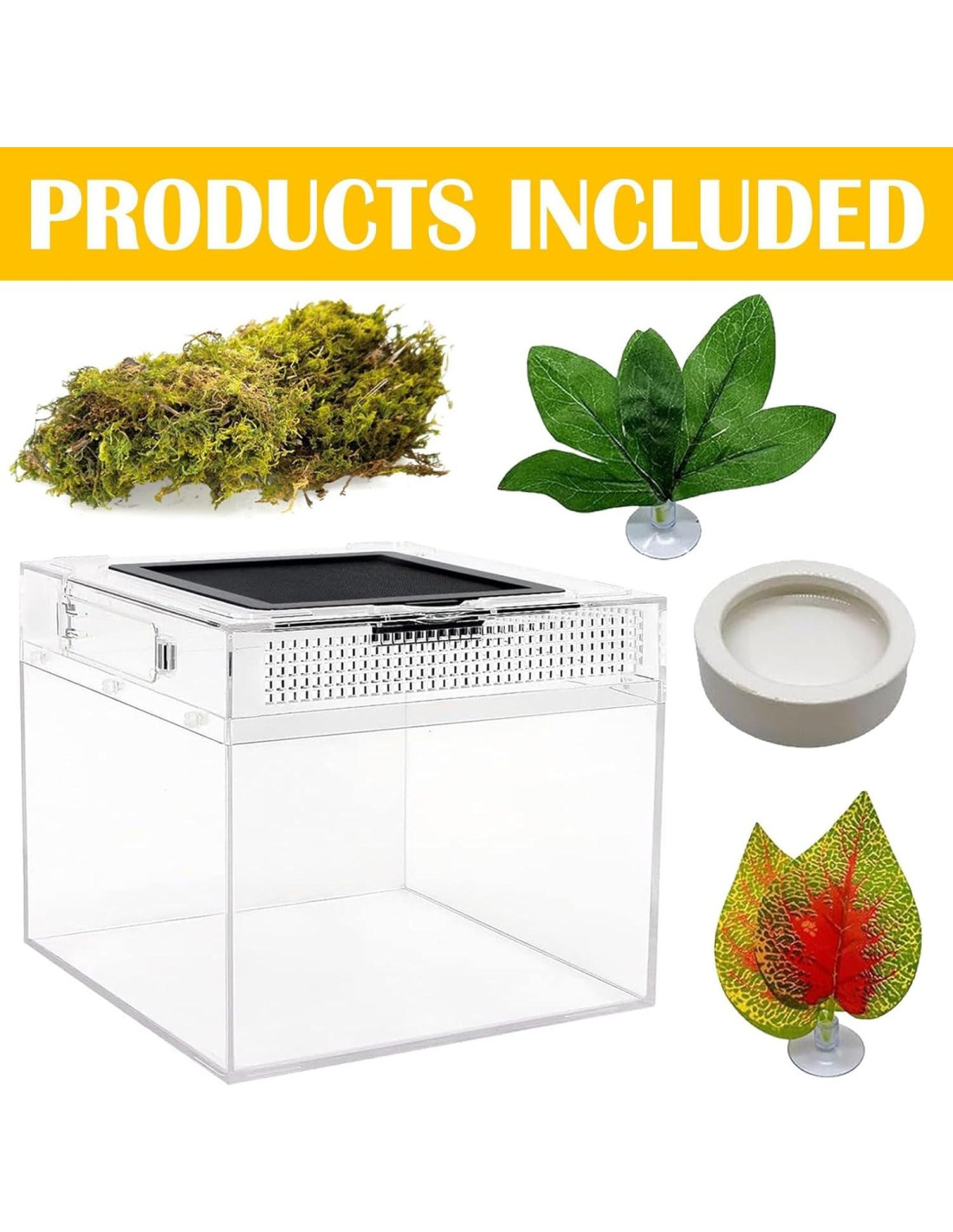 - KIT COMPLETO DE 5 ACCESORIOS: este kit de inicio para acuario de reptiles de 20.32cm x 20.32cm x 15.24cm (8"x8"x6") incluye alimentador de reptiles, tazón de comida, sustrato de musgo y 2 decoraciones de plantas con hojas para satisfacer tus necesidades básicas.