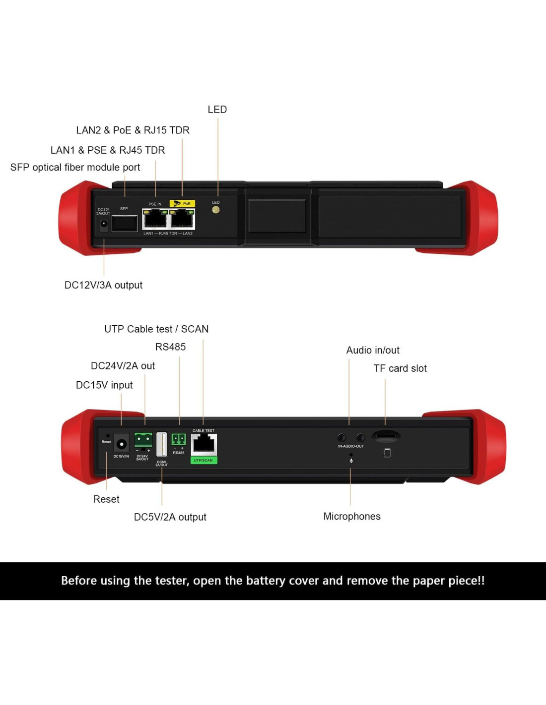 - [ Probador de Cámara CCTV Multifuncional ] El sistema operativo del probador IPC es Android. Analizador de WIFI: soporta analizar la intensidad de la señal wifi, canal, nivel de canal, soporta crear punto de acceso WI-FI. Detección de PoE: medición de voltaje del switch PoE o fuente de alimentación PSE y estado de conexión del cable. Gestión de Energía: verifica el voltaje y la potencia en tiempo real de PoE, salida de potencia DC12V, DC24V y entrada PSE, entrada de potencia DC15V. Monitoreo de datos: Captura y analiza los datos de comando del dispositivo de control, también puede enviar hexadecimal. Entrada de potencia: DC15V, Salida de potencia: DC12V/3A, DC24V/2A, DC5V/2A