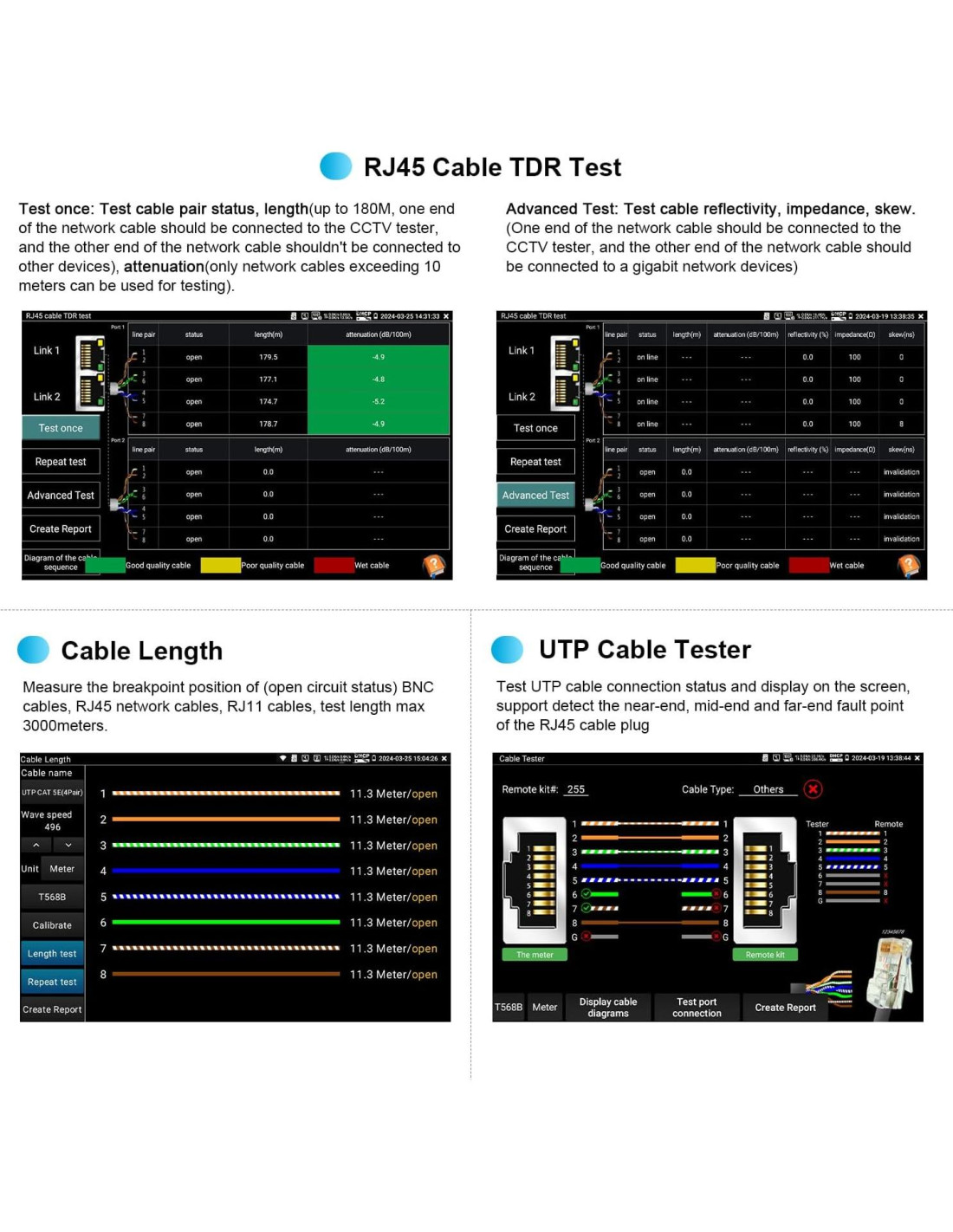 - [ Probador de Cables ] Prueba TDR de Cable RJ45: puede probar el estado del par de cables, longitud (hasta 180 metros), atenuación (solo se pueden usar cables de red que superen los 10 metros para la prueba), reflectividad, impedancia, skew. Probador de Cable UTP: prueba el estado de conexión del cable UTP y lo muestra en la pantalla, soporta detectar el punto de falla de extremo cercano, medio y lejano del conector RJ45. Prueba de Longitud de Cable: Mide la posición del punto de ruptura de cables BNC (estado de circuito abierto), cables de red RJ45, cables RJ11, prueba de longitud máxima 3000 metros
