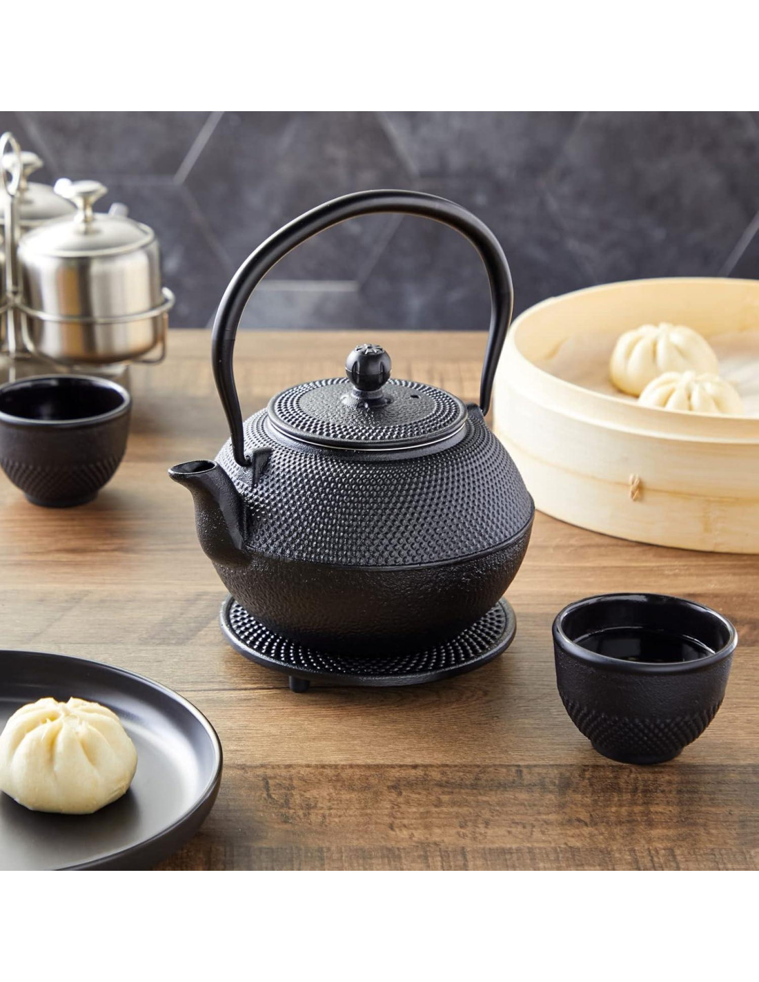 - Juego de té elegante: Disfruta sirviendo té suelto caliente para hasta dos personas con este juego de té japonés, que incluye una tetera de hierro fundido, un salvamanteles y dos tazas de té de hierro fundido