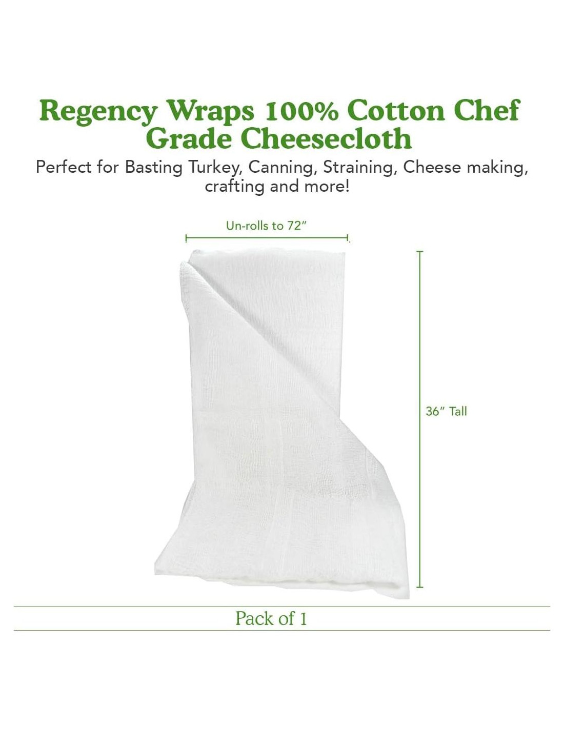 La tela de queso 100% algodón de Regency Wraps es excelente para cientos de usos en la cocina y en el hogar. Es la adición perfecta a tu arsenal de cocina. Nuestras telas de queso están hechas de 100% algodón sin blanquear. Han sido probadas en laboratorio y son seguras para alimentos, sin metales, blanqueadores ni tintes. Nuestras telas de queso de grado chef son ideales para colar sopas y salsas, bañar pavo y aves, cocinar al vapor verduras y hacer queso, yogur, leche de nuez y kombucha. También es excelente para conservas, escalfar y cocinar al vapor, así como para limpiar, hacer manualidades y decorar. Esta tela de queso es segura para horno, pero asegúrate de mantenerla alejada de llamas abiertas. También es libre de pelusa, lo que la hace perfecta para limpiar ventanas, espejos y más. Esta versátil tela de queso para cocinar es un imprescindible para cualquier entusiasta de la cocina. Consigue la tuya hoy y quita el estrés de colar, cocinar y limpiar.