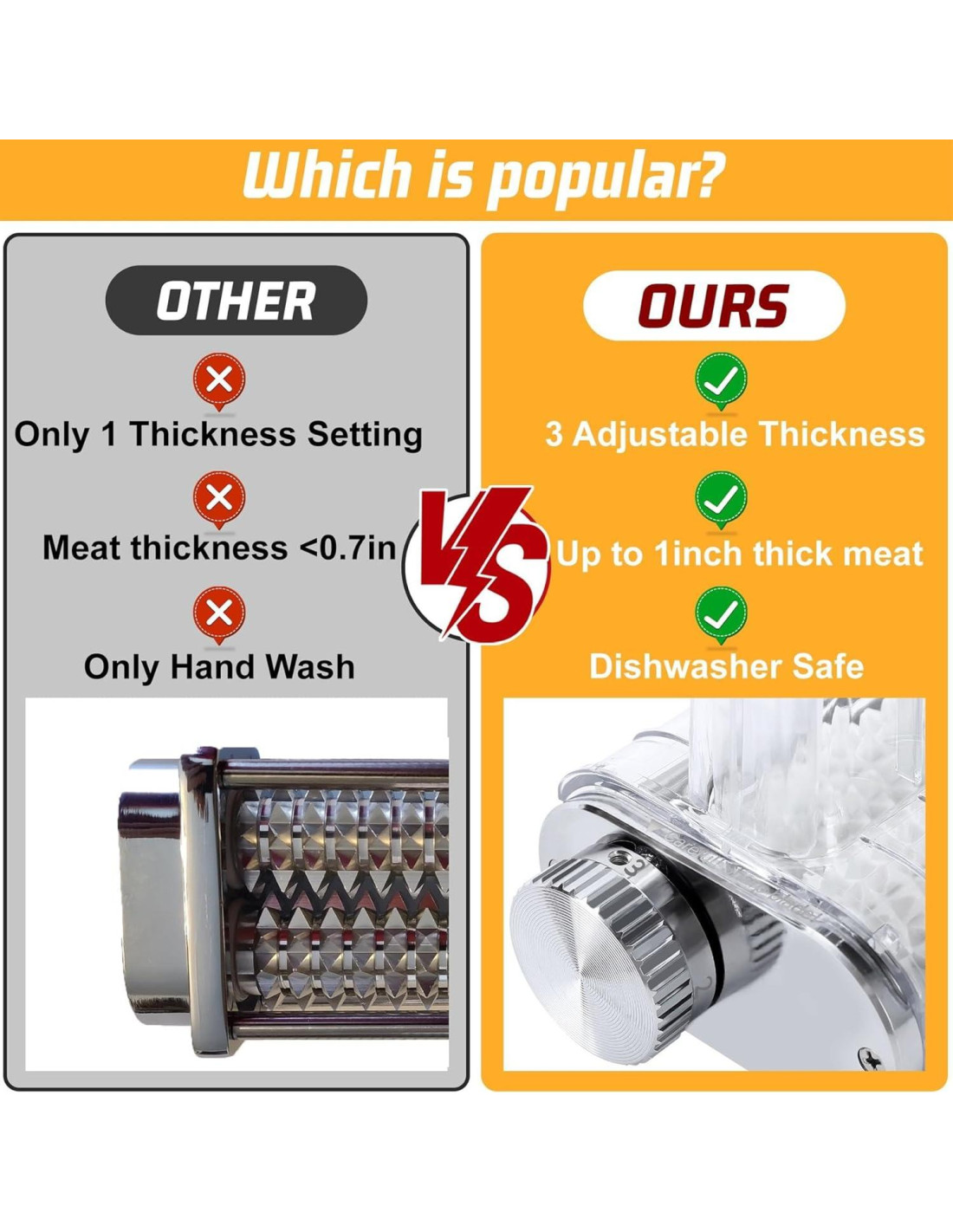 - Diseño fácil de usar: 3 configuraciones de ablandado ajustables - ¡Perfecto para cada corte! Personaliza la ternura de tu carne con 3 configuraciones de precisión: normalmente la configuración 3 para filetes gruesos, 2 media para chuletas de cerdo, 1 para pollo delicado. Obtén resultados de calidad de restaurante para cualquier receta, desde cenas entre semana hasta banquetes de barbacoa.