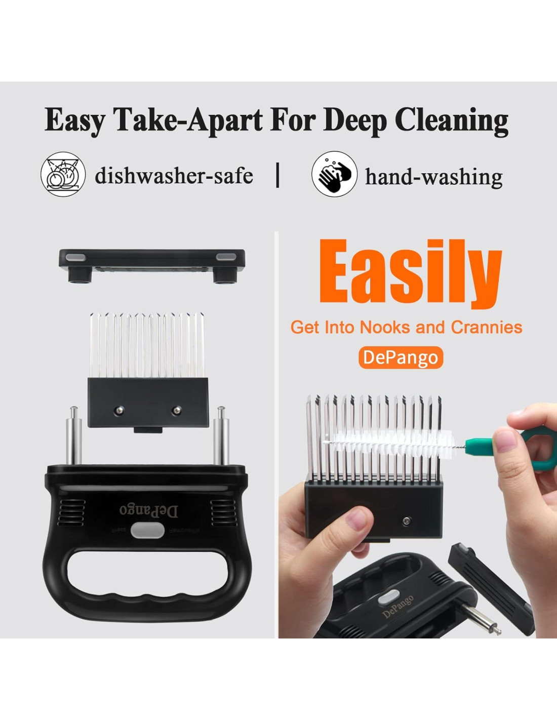 - Limpieza, Sin Retención de Agua --> La herramienta ablandadora de carne DePango es completamente desmontable y se desarma por completo para una fácil limpieza: agarre de mano, modelo de aguja de 48 cuchillas, barra inferior, protección; Orificios múltiples integrados en los lados del agarre para un rápido drenaje de agua; el cepillo de limpieza adjunto ayuda a limpiar cada cuchilla; Fácil de ensamblar y desensamblar, ningún residuo de carne se queda atrapado ni agua jabonosa oculta en el mango; Mantén a tu familia saludable