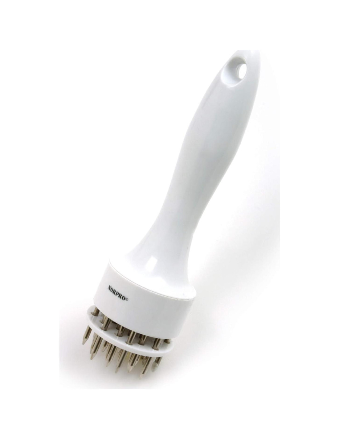 Descripción del producto Medidas: 7.5" x 2" x 2" / 19cm x 5cm x 5cm Este ablandador mejorará la textura y el sabor de las aves, pescado o carne de res, mientras también acelera el tiempo de cocción. 24 púas de acero inoxidable descomponen las fibras de carne duras y los tejidos conectivos y permiten que la marinada se absorba más rápido en la carne, creando resultados más sabrosos y jugosos. Mecanismo de acción de resorte de alta resistencia controla la acción. Se recomienda lavar a mano. Norpro fue fundada en 1973 con la visión de diseñar, fabricar y suministrar utensilios de cocina de la más alta calidad. La oferta de Norpro de productos innovadores y de alta calidad para cocinar, preparar y servir alimentos se produce con materiales y mano de obra superiores. Amazon.com Esta herramienta de grado profesional, con púas de acero inoxidable para descomponer las fibras de carne duras, proporciona un ablandamiento de carne controlado y uniforme. También puedes usarla para perforar carnes antes de marinarlas para que los sabores penetren profundamente. El disco de plástico de 2 pulgadas (5,08 cm) de diámetro en la parte inferior está cargado por resorte. Proporciona un control preciso cuando se presiona hacia abajo el mango del ablandador, de modo que las púas pasen a través de los agujeros del disco y entren en la carne. Cuando sueltas la presión hacia abajo, el mango se eleva nuevamente, listo para ablandar otra sección con la misma acción suave y uniforme. Esta herramienta duradera y de alta resistencia (7-1/2 pulgadas (19,05 cm) de alto) durará toda la vida. También es apta para lavavajillas. --Fred Brack