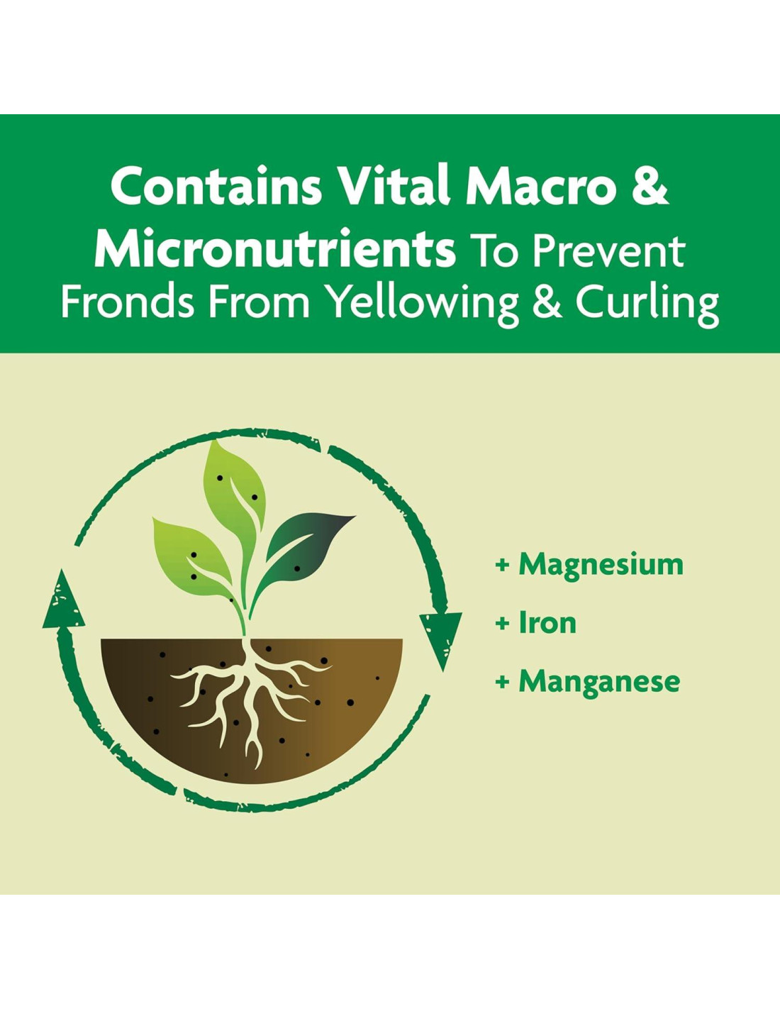- Este alimento para plantas contiene magnesio, hierro y manganeso para cultivar palmeras, cícadas y plantas tropicales exuberantes y ayudar a prevenir que las hojas se pongan amarillas y se enrosquen