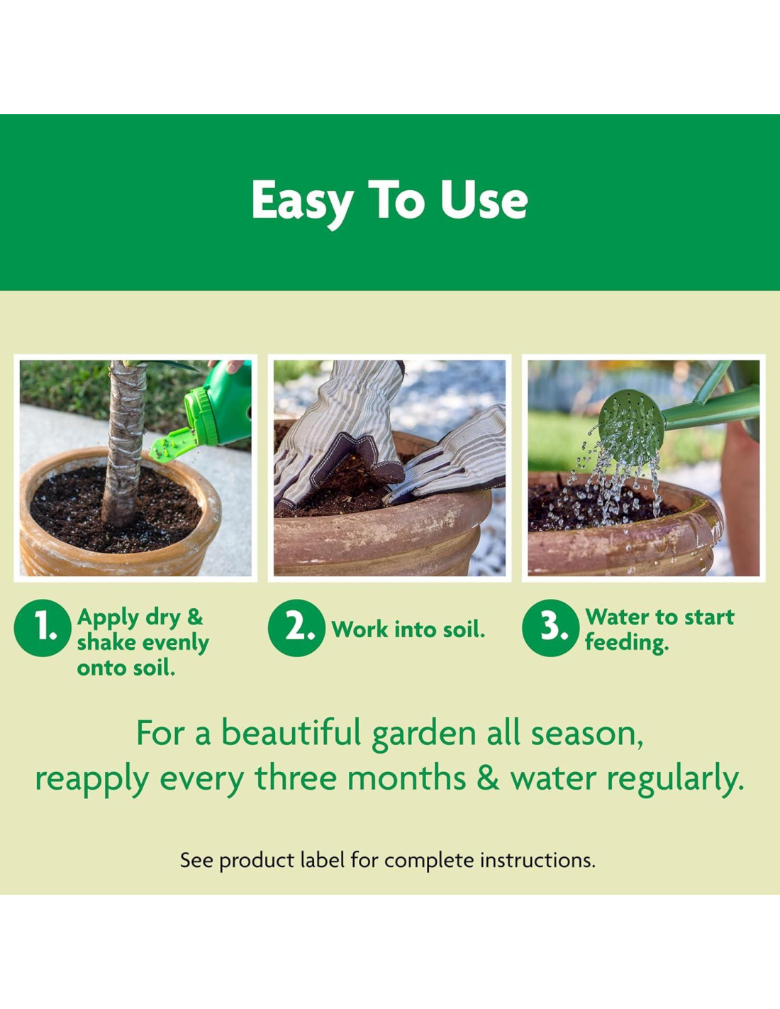 ¡Nutre tus palmeras y arbustos! El alimento para plantas de palma Miracle-Gro Shake 'n Feed contiene magnesio, hierro y manganeso para cultivar palmeras, cícadas y plantas tropicales exuberantes y ayudar a prevenir que las hojas se pongan amarillas y se enrosquen. También contiene compost: los microbios descomponen el compost en nutrientes que apoyan el desarrollo de raíces, lo que aumenta la eficiencia del agua y hace crecer plantas fuertes. Este producto de jardinería se puede usar con plantas en contenedores interiores o exteriores, así como con plantas en el suelo. Para aplicar a plantas en el suelo y plantas en contenedores establecidas, agita uniformemente sobre el suelo dentro de la extensión de las hojas de la palma utilizando las tasas de aplicación recomendadas en la etiqueta. Evita el contacto con el tronco y el follaje. Trabaja el alimento para plantas en las 2.54-7.62 cm de suelo, luego riega para comenzar a alimentar. Al usar con nuevas plantas en contenedores, mezcla en el suelo en el momento de la siembra, planta tu palma como de costumbre y riega para comenzar a alimentar. Para un hermoso jardín durante toda la temporada, reaplica el alimento para plantas de palma Miracle-Gro Shake 'N Feed cada 3 meses y riega tus plantas regularmente.