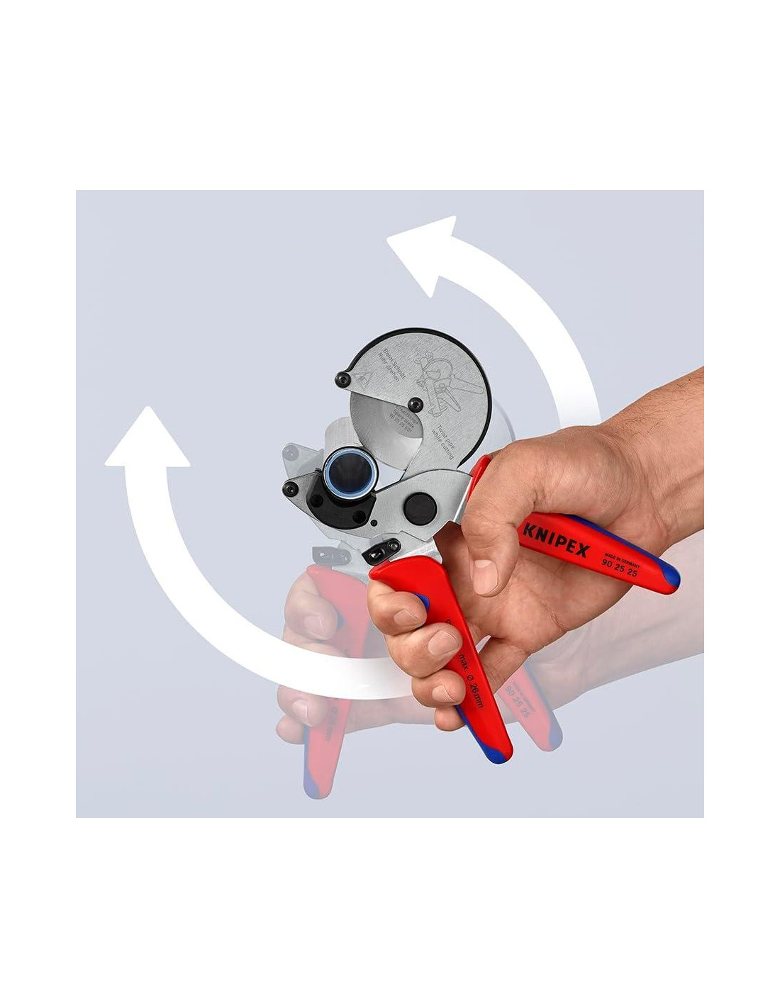 Cortadora de tubos 90 25 25 para tuberías compuestas y plásticas. Hasta un 60 por ciento menos esfuerzo: la rueda de corte que gira libremente permite que la tubería se rote con mínima fricción al cortar. Resultados de corte óptimos: la rotación permite que la rueda de corte penetre en la tubería sin esfuerzo y con mínima deformación. Amplios soportes plásticos permiten cortes perfectos en ángulo recto. Corta tuberías de conducto de aluminio compuesto y plástico más fácilmente que las tijeras convencionales con una hoja fija. También es adecuada para tuberías compuestas con mayor grosor de capa de aluminio (por ejemplo, Geberit Mepla). Para cortar tuberías compuestas y plásticas de hasta un diámetro de 26 (66.04 cm). Permite secciones de corrección muy cortas. Con mecanismo de bloqueo para un transporte seguro. Con mangos ergonómicos de múltiples componentes. Rueda de corte de repuesto disponible (Art. No. 90 25 25 E01).