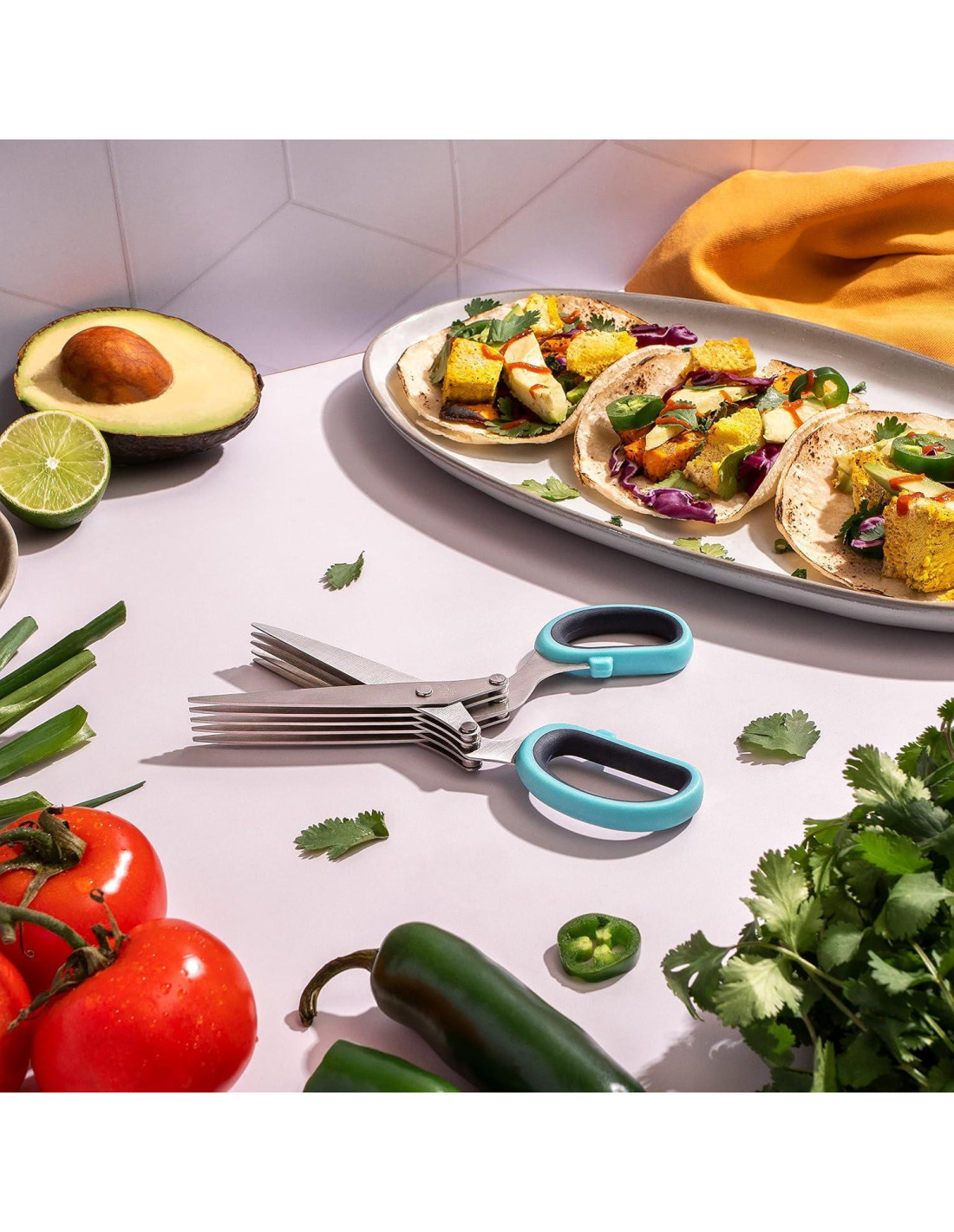 - HERRAMIENTA DE COCINA VERSÁTIL: Prepara ensaladas, adorna alimentos o corta hierbas frescas directamente sobre los platos, mejorando el sabor y la preparación. Las tijeras de múltiples cuchillas destruyen papel y son geniales para bordes decorativos de manualidades también.