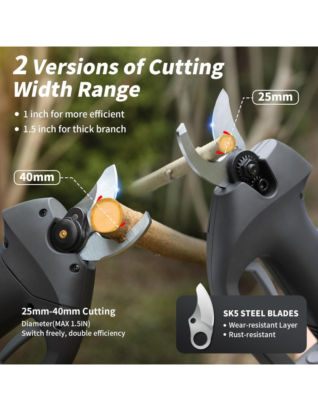 - HOJAS PREMIUM Y DOS TAMAÑOS DE DIÁMETRO DE CORTE: Las podadoras eléctricas están equipadas con hojas de acero SK5 de alto carbono que ofrecen una excepcional agudeza y resistencia. Cortan flexiblemente ramas de 20-40mm (0.79 - 1.5 pulgadas) de diámetro y ofrecen protección duradera contra la corrosión por óxido. Presiona y mantén el botón de encendido durante 3 segundos para ajustar el diámetro de corte a 1in o 1.5in, adecuado para tareas de poda versátiles. Como la poda de ramas, la formación de plantas de flores