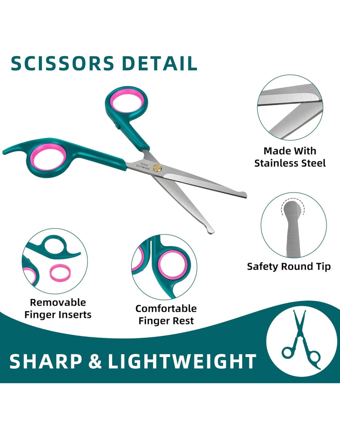 - SEGURIDAD ANTE TODO: Reconocemos que las mascotas pueden ser impredecibles y que pueden ocurrir accidentes durante el acicalamiento. Nuestras tijeras están diseñadas con puntas redondeadas para minimizar el riesgo de pinchazos dolorosos, asegurando que su mascota permanezca cómoda y segura durante todo el proceso de acicalamiento.