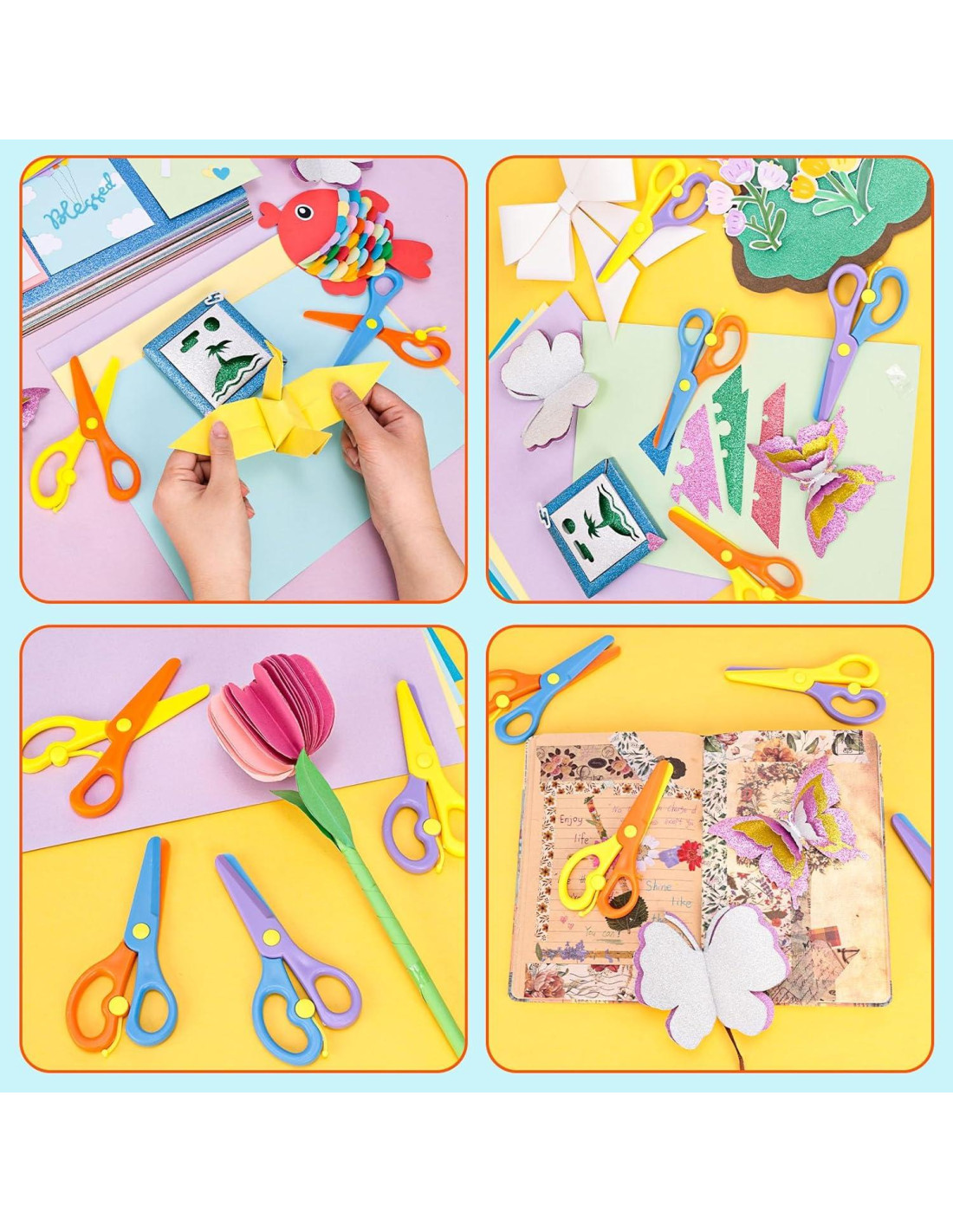 - Lo que recibirás: 4 pares de tijeras de seguridad de plástico (doble color: púrpura, amarillo, naranja, azul). Cada par mide 6.35 x 13.72 cm con colores vibrantes y brillantes que atraen a los niños - para desarrollar habilidades de cognición del color