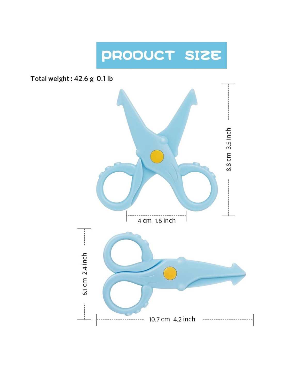 - Las tijeras para niños pequeños miden 10cm de largo, 6cm de ancho y pesan 14g, lo que es muy ligero y no lastimará los dedos de los niños.