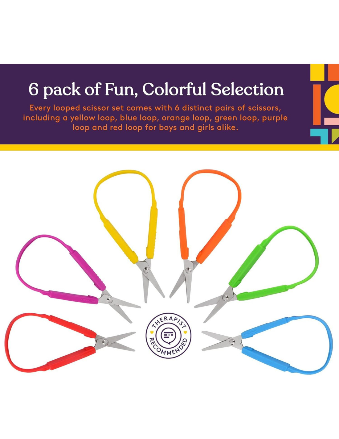 - Selección Divertida y Colorida - Cada juego de tijeras con loop viene con seis pares distintos de tijeras, incluyendo un loop amarillo, loop azul, loop naranja, loop verde, loop púrpura y loop rojo para niños y niñas por igual.