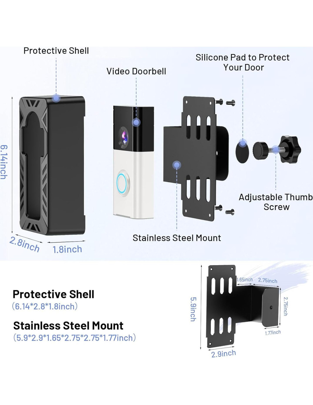Soporte de timbre mejorado anti-robo, protege mejor tu cámara de timbre de video y la propiedad de tu hogar. No perforar soporte de timbre de video, sin preocupaciones de romper las puertas de tu apartamento. Soporte de timbre con acero inoxidable, que previene la oxidación y protege tu timbre de video. El soporte de timbre Satisure puede envolver completamente tu timbre de video 360, más estable y evitando robos. Clips fijos ajustables aseguran que el soporte de timbre sea compatible con diferentes puertas de hogar/apartamento.