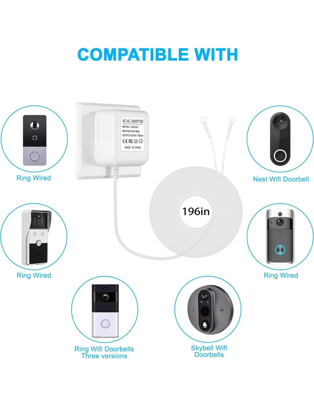 El adaptador de timbre multifuncional te ahorra la molestia de reemplazar la batería con frecuencia. Un diseño especial y materiales de alta calidad aseguran que el adaptador se mantenga a baja temperatura para cargar de manera segura, adecuado para varios videos de timbre y termostatos. Voltaje de entrada: 120 V CA, 60 Hz, Voltaje de salida: 24 V CA, 500 mA, Dimensiones: 9.9 x 6.6 x 6.1 cm (3.9 x 2.6 x 2.4 pulgadas) Longitud del cable: 500 cm (16.5FT) lo suficientemente largo para conectar un enchufe y el timbre. Tipo de cable: cable de cobre trenzado.
