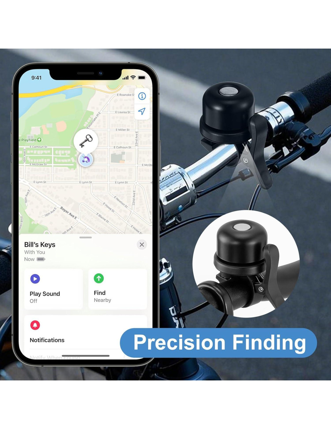 - Diseño Invisible: esta campana de bicicleta utiliza un diseño innovador para hacer que tu etiqueta sea invisible. Simplemente adjúntala de manera inteligente a tu bicicleta para rastrear fácilmente vehículos perdidos o robados, o monitorear las actividades de tu hijo mientras monta en la ciudad
