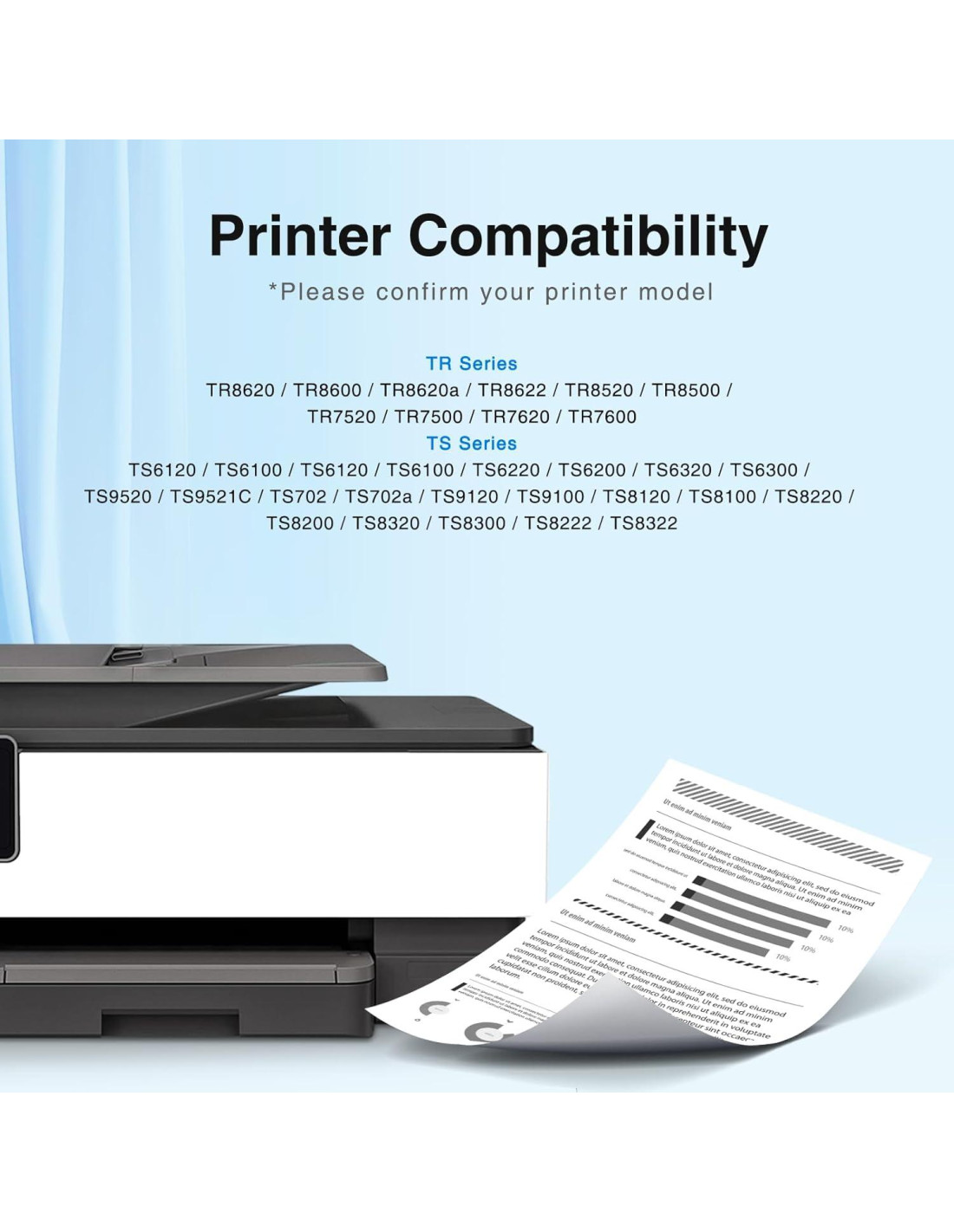 - Alta compatibilidad: para TR8520, TR8620, TR8620a, TR7520, TR7620; TS6120, TS6220, TS6320, TS9520, TS9521C, TS702, TS702a; TS9120 TS8320 TS8120 TS8220 TS8222 TS8322, TS9100, TR8600, TR8500, TR7500, TR7600, TS8300, TS8200, TS8100, TS6300, TS6200, TS6100 serie impresora