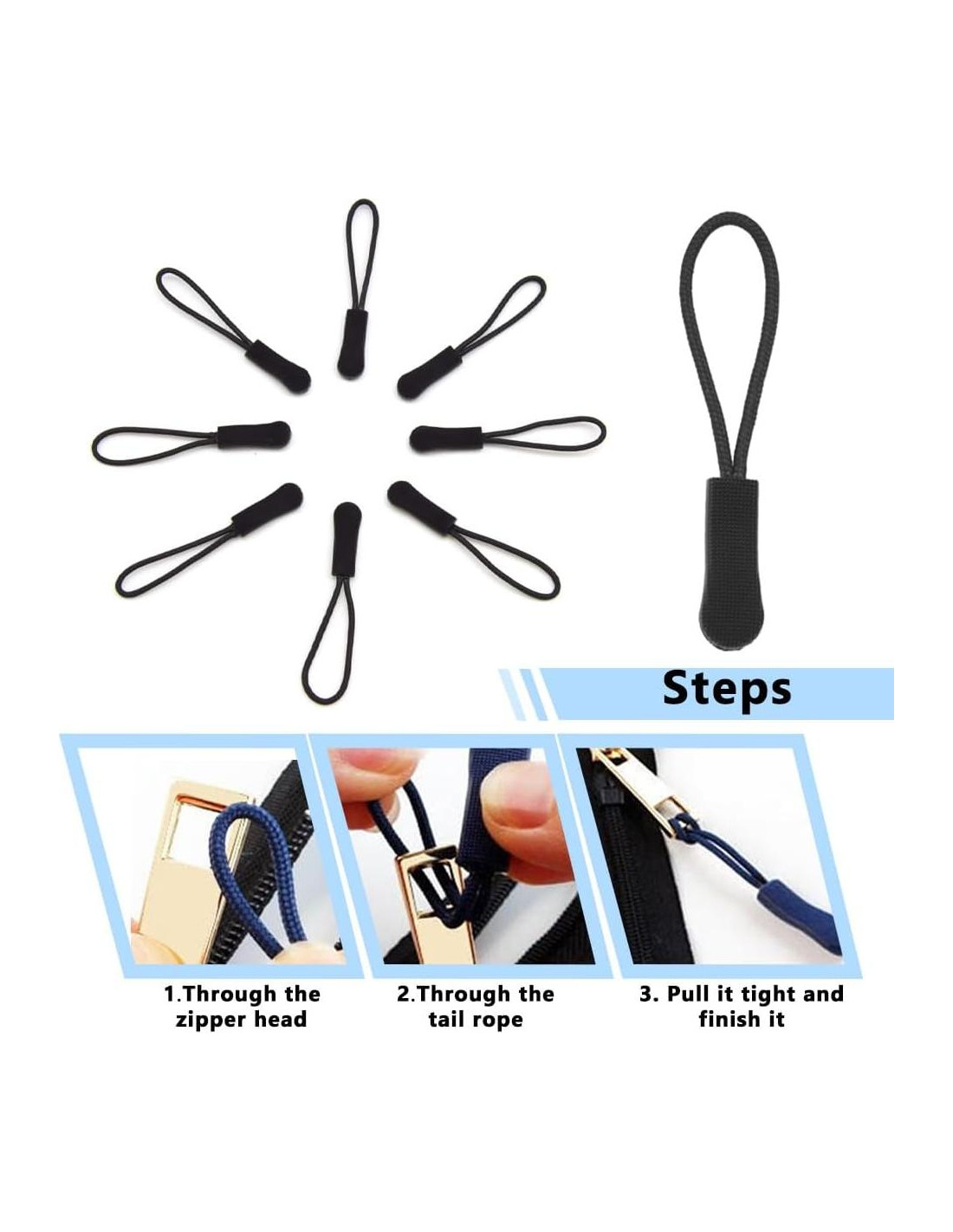 - [Aplicaciones] El cordón del cabezal de la cremallera se puede fijar fácilmente en todo tipo de cabezales de cremallera, aumentar la longitud del cabezal de la cremallera o reemplazar el cabezal de la cremallera. Adecuado para mochilas, ropa, billeteras, llaveros, maletas, etc.