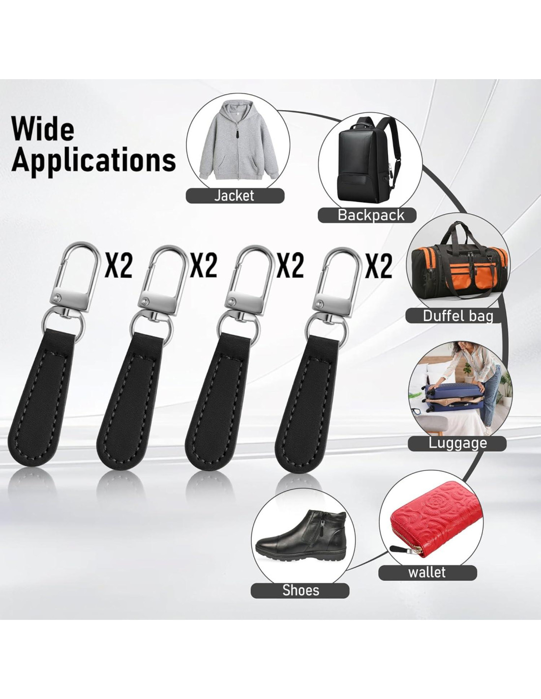 - Multiuso: Los tiradores de cremallera se adaptan a la mayoría de las cremalleras como reemplazo en la vida diaria o para adjuntar a la cremallera para agregar longitud como tiradores de cremalleras de maletas, tiradores de cremalleras de equipaje, tiradores de cremalleras de mochilas, tiradores de cremalleras de bolsas, tiradores de cremalleras de chaquetas, tiradores de cremalleras de botas, tiradores de cremalleras de maletas, tiradores de cremalleras de carteras.