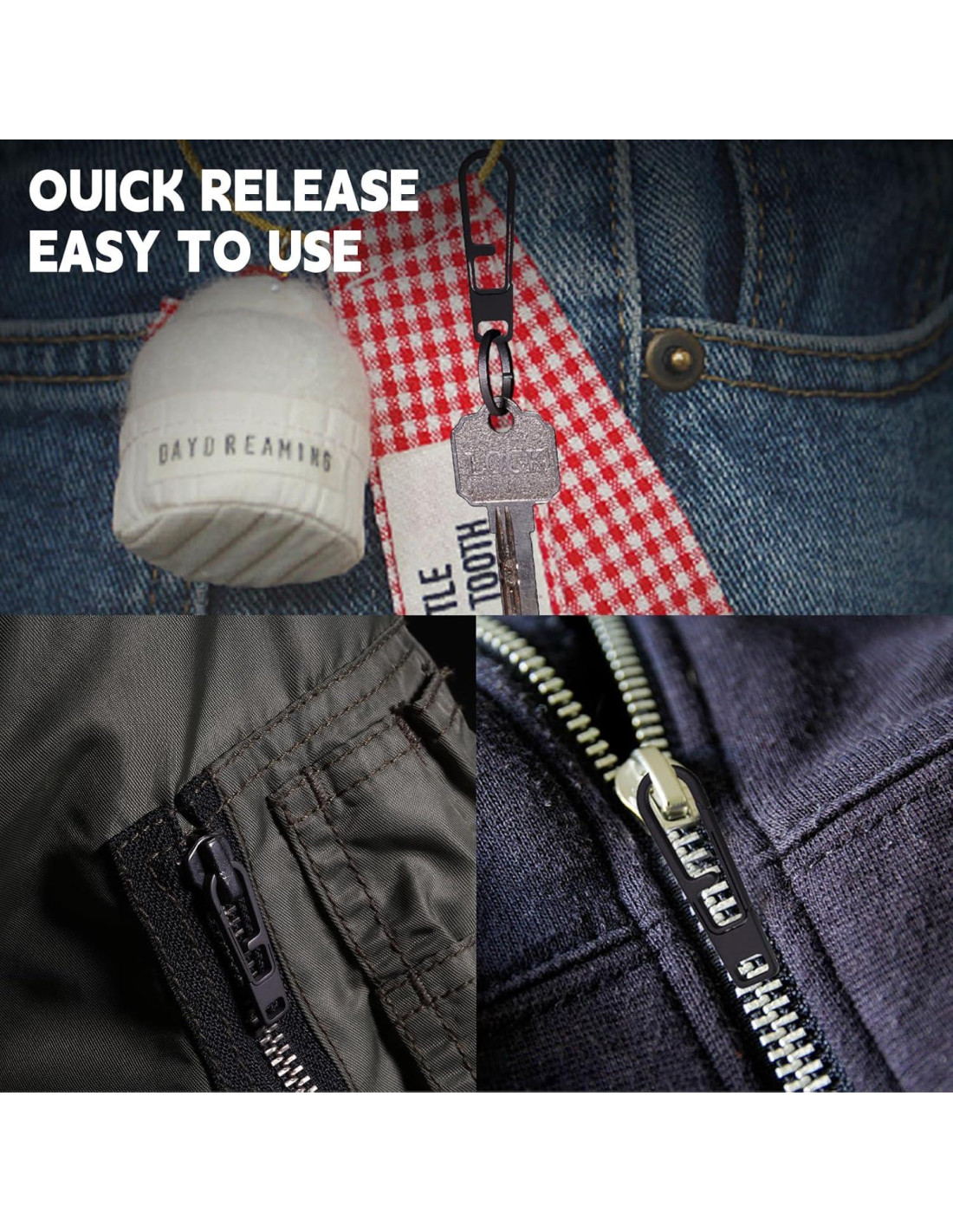 - Ajuste Universal para Todas las Cremalleras: Compatible con la mayoría de las cremalleras en mochilas, equipaje, chaquetas, botas, bolsos y más. También se puede usar como un mini mosquetón para organizar artículos pequeños.