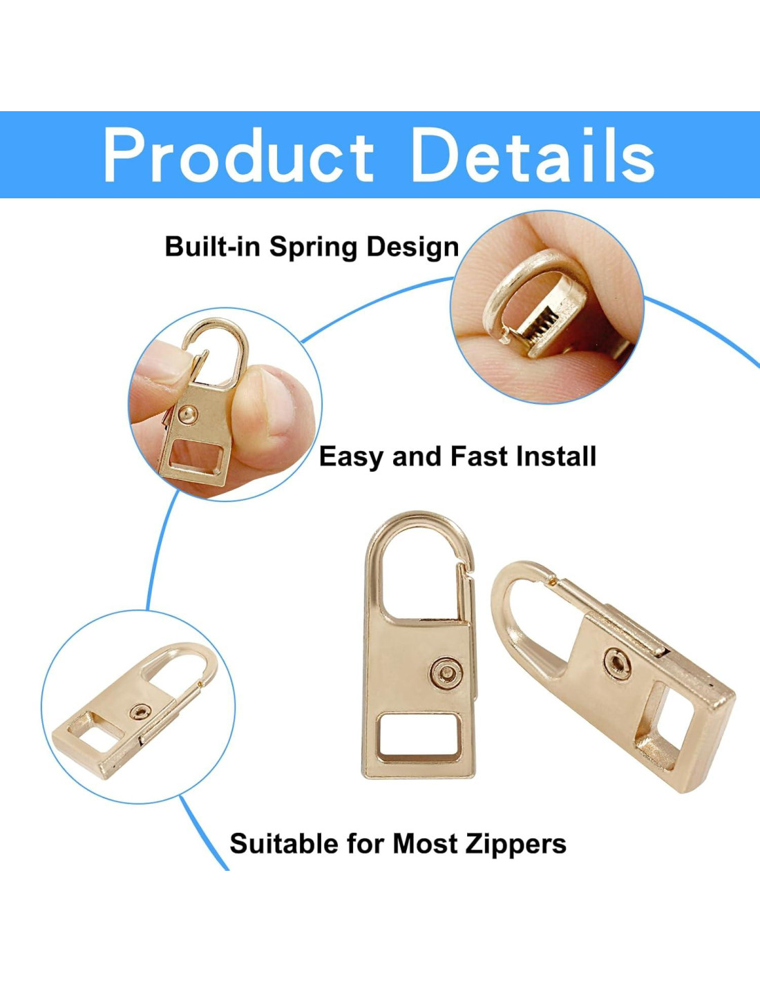 - Tamaño adecuado: Tamaño pequeño longitud total: 27mm/1.06 pulgadas; ancho: 11mm/0.43 pulgadas. Tamaño mediano longitud total: 30mm/1.18 pulgadas; ancho: 8.5mm/0.33 pulgadas; Tamaño grande longitud total: 37mm/1.46 pulgadas; ancho: 10mm/0.39 pulgadas. Son pequeños en tamaño, fuertes en peso, fáciles de llevar, y el diseño de tamaño adecuado se puede aplicar a la mayoría de los tamaños de cabezales de cremallera.