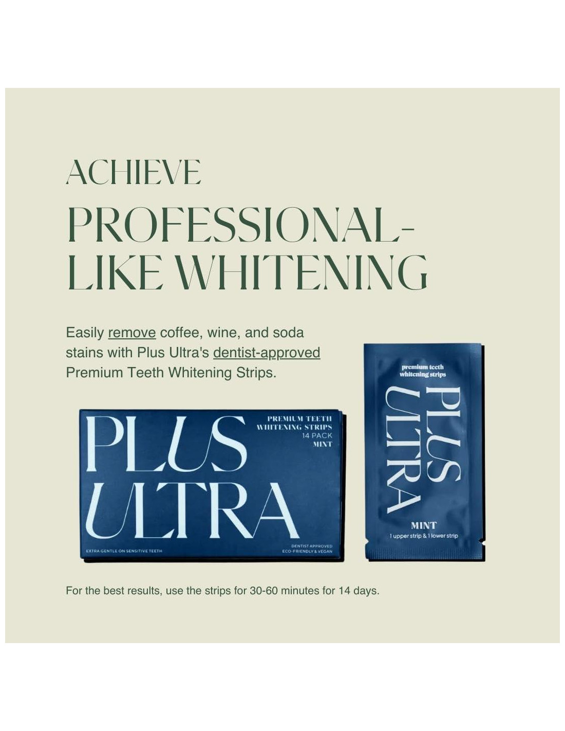 - BLANQUEAMIENTO DE CALIDAD PROFESIONAL: Elimina sin esfuerzo las manchas de café, vino y refrescos con las tiras blanqueadoras premium aprobadas por dentistas de PLUS ULTRA. Para obtener resultados óptimos, usa las tiras durante 30-60 minutos diarios durante 14 días.