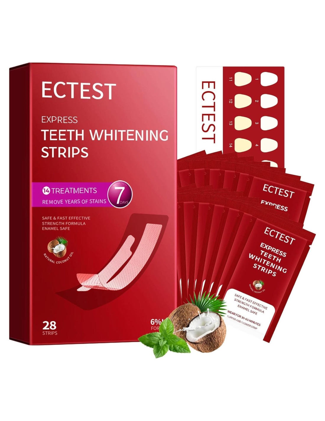 - TIRAS BLANQUEADORAS DENTALES PROFESIONALES: Estas tiras blanqueadoras de dientes ECTEST están hechas de ingredientes profesionales para blanqueamiento dental que incluyen 6% de Peróxido de Hidrógeno según el consejo del dentista. Estas tiras blanqueadoras de sabor coco son la mejor opción para la salud de tus dientes