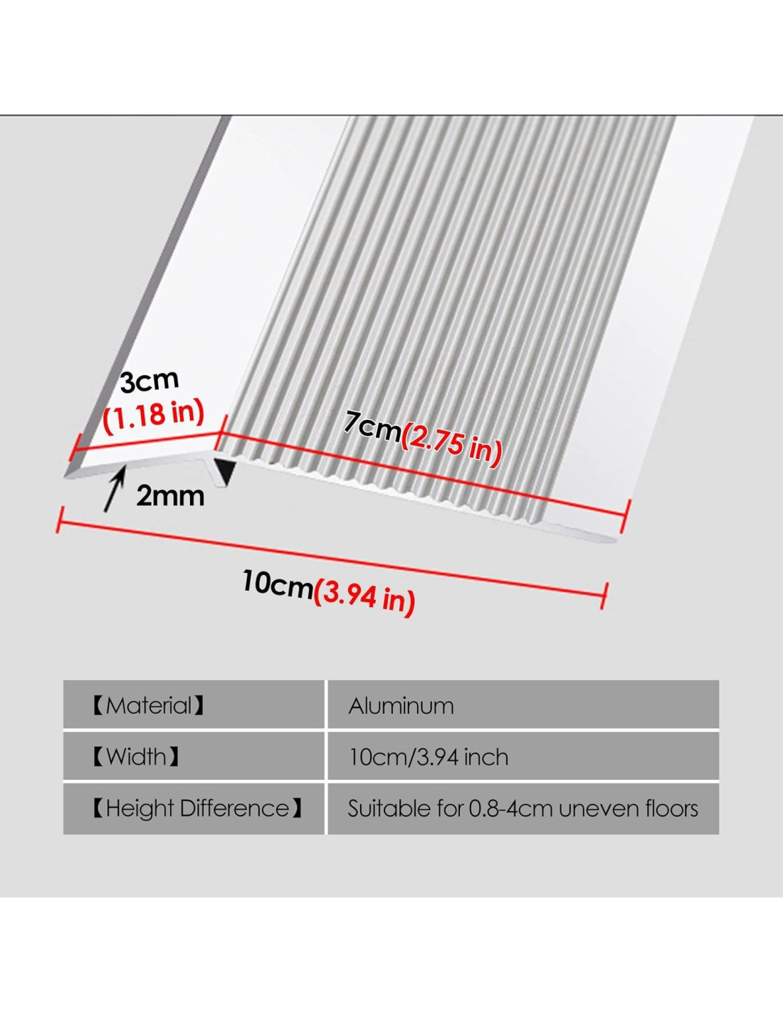El recorte de alfombra cubre fácilmente una costura o un hueco entre dos superficies de suelo de altura desigual. Para usar en umbrales, entradas de habitaciones u otros lugares donde se encuentren dos superficies de suelo desiguales. Especificación: - Material: Aluminio - Ancho: 10cm/3.93 pulgadas - Conecta a suelos desiguales hasta 1-4cm/0.4"-1.57" de diferencia de altura - Contenido: 1 * tira de transición de suelo (el producto coincidente en la imagen del producto no está incluido en el paquete) Característica: - Diseño de bajo perfil que previene tropiezos y caídas. - No se incluyó pegamento. No resbala cuando está mojado. - Excelente para acabados en casa, oficina o comercial. - El recorte de alfombra le da a su suelo un borde limpio que previene que los bordes de la alfombra se deshilachen. - Adecuado para la transición de umbral entre alfombra y azulejos de suelo, de suelo a alfombra, de alfombra a suelo y decoración de recorte de borde. Consejos: - Los productos de medición manual pueden tener dimensiones de unos pocos centímetros de diferencia, por favor entienda. - Puede haber algunas diferencias entre la imagen y el producto debido a razones de visualización e iluminación, por favor refiérase al producto real.