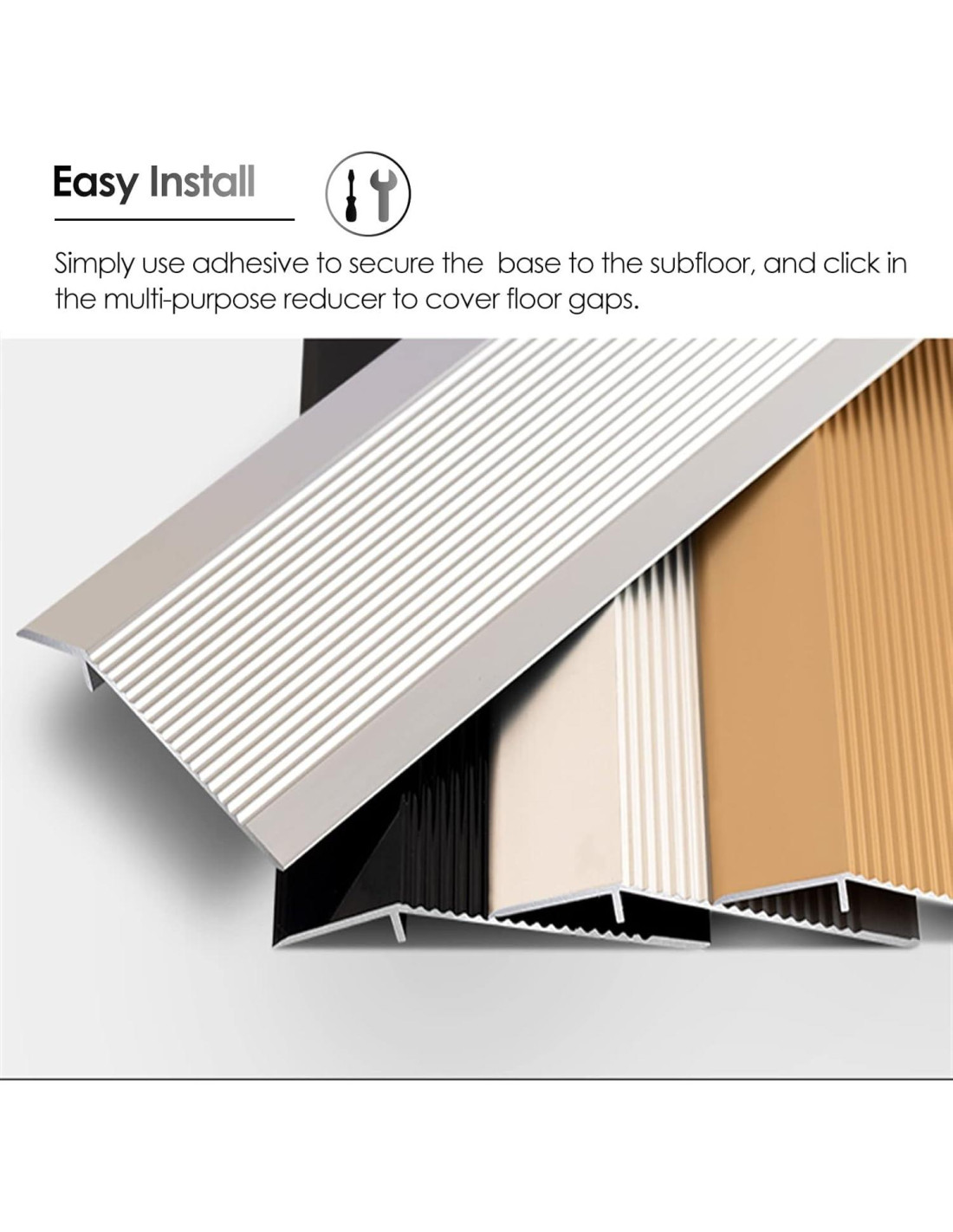 - Fácil instalación: Simplemente use adhesivo para asegurar la base al subsuelo, y haga clic en el reductor multipropósito para cubrir los huecos del suelo. (No viene con ningún adhesivo)