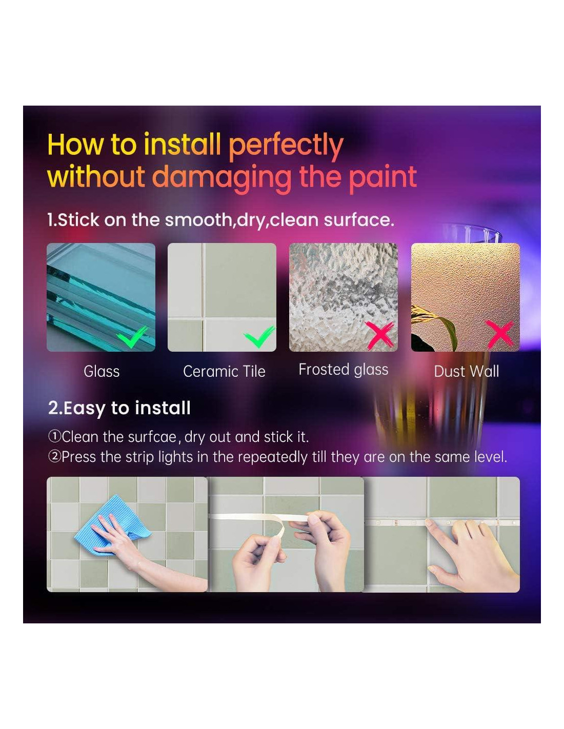 - [Instalación en minutos] Instalación muy simple. Solo conecte las partes e instale donde desee. La cinta autoadhesiva mejorada facilita pegarla en superficies limpias y secas. Solo siga las instrucciones del manual y puede terminar en minutos. Le recomendamos que pruebe las luces antes de la instalación. Tenga en cuenta que NO es impermeable y está diseñado solo para uso en interiores.