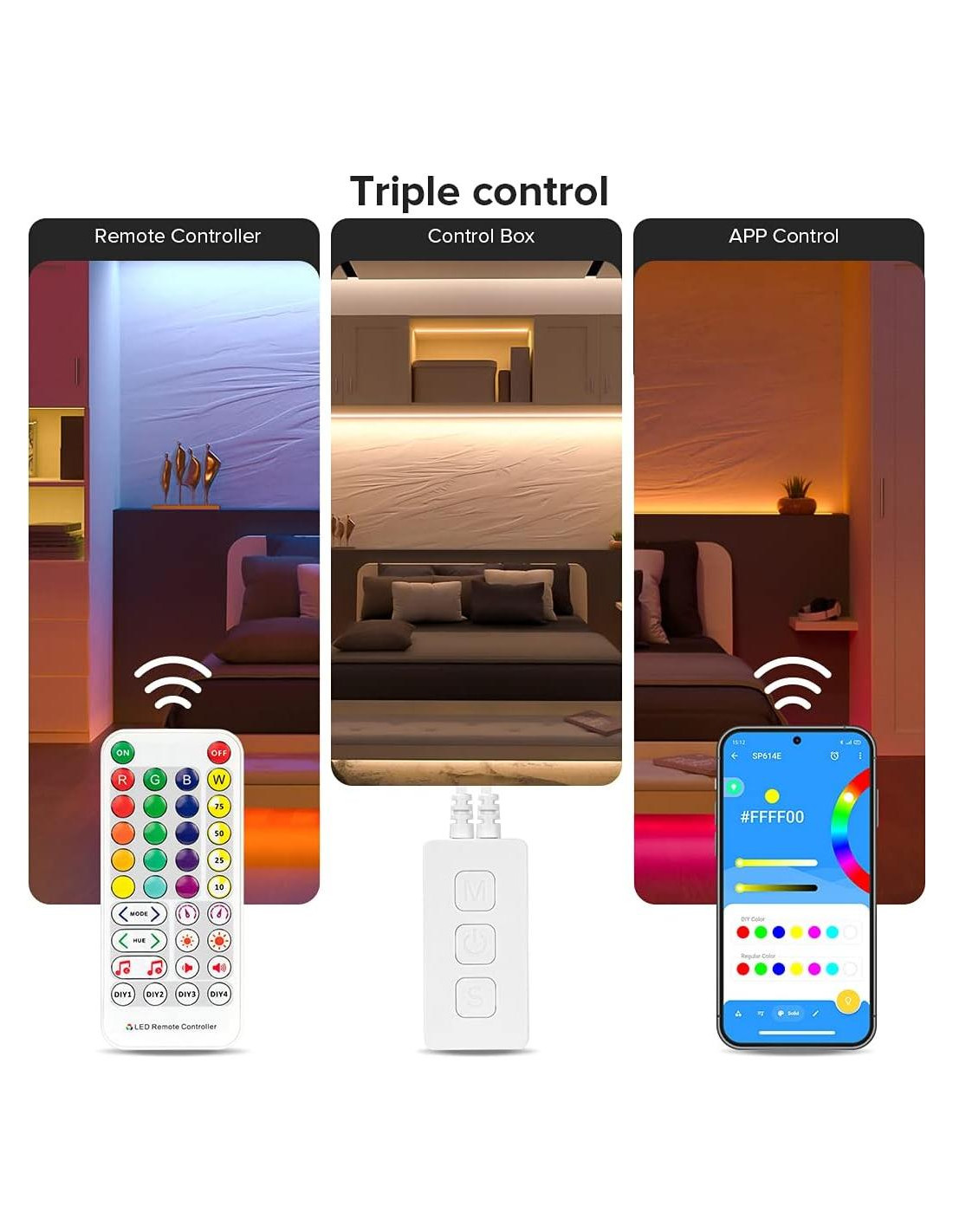 - Tres formas de controlar: Toma el control de tus luces LED con la APP BanlanX, el control remoto o la caja de control. Con una conexión bluetooth super estable, puedes cambiar colores, Rojo, Verde, Azul, Blanco puro, diferentes modos, Velocidad, encender/apagar las luces, o ajustar el brillo dentro de un rango de control bluetooth de 10m (32.8ft).
