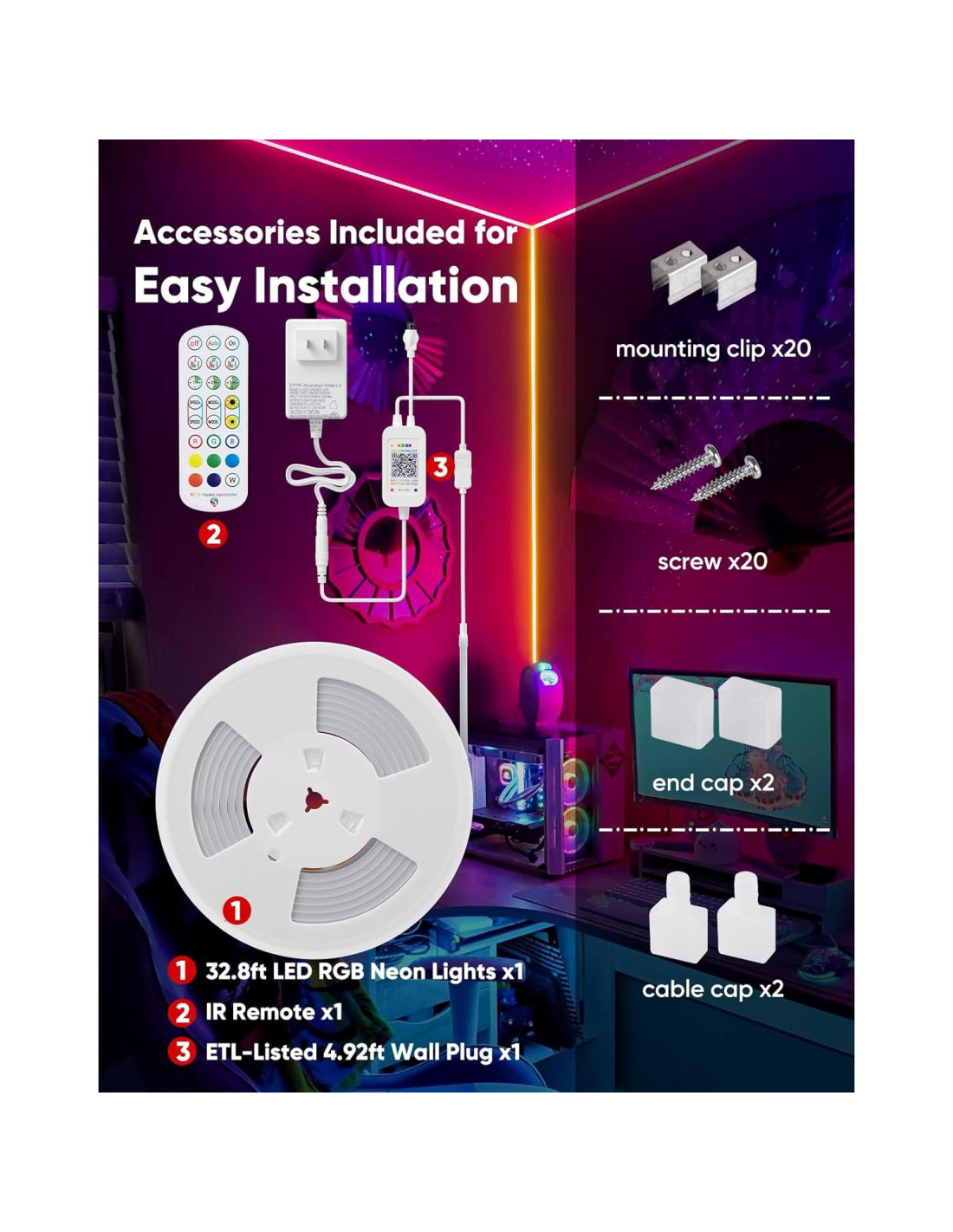 - Componentes incluidos: 1x luz de neón de silicona RGB de 10m, controlador, panel remoto, 20x clips de montaje, 2x tapa de cable, tornillos de extremo, manual del usuario