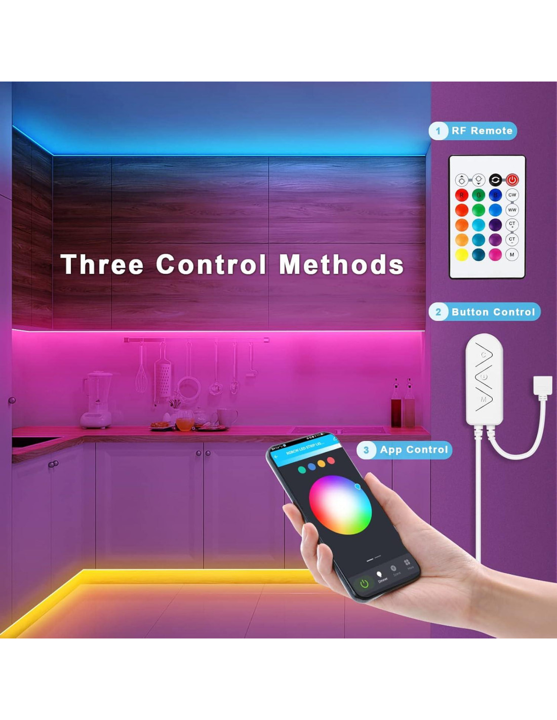 - Tres Métodos de Control: El kit de tira LED funciona con la app tuya a través de conexión Bluetooth, usando control remoto RF y controlador de tres botones se puede controlar la luz LED fácilmente.