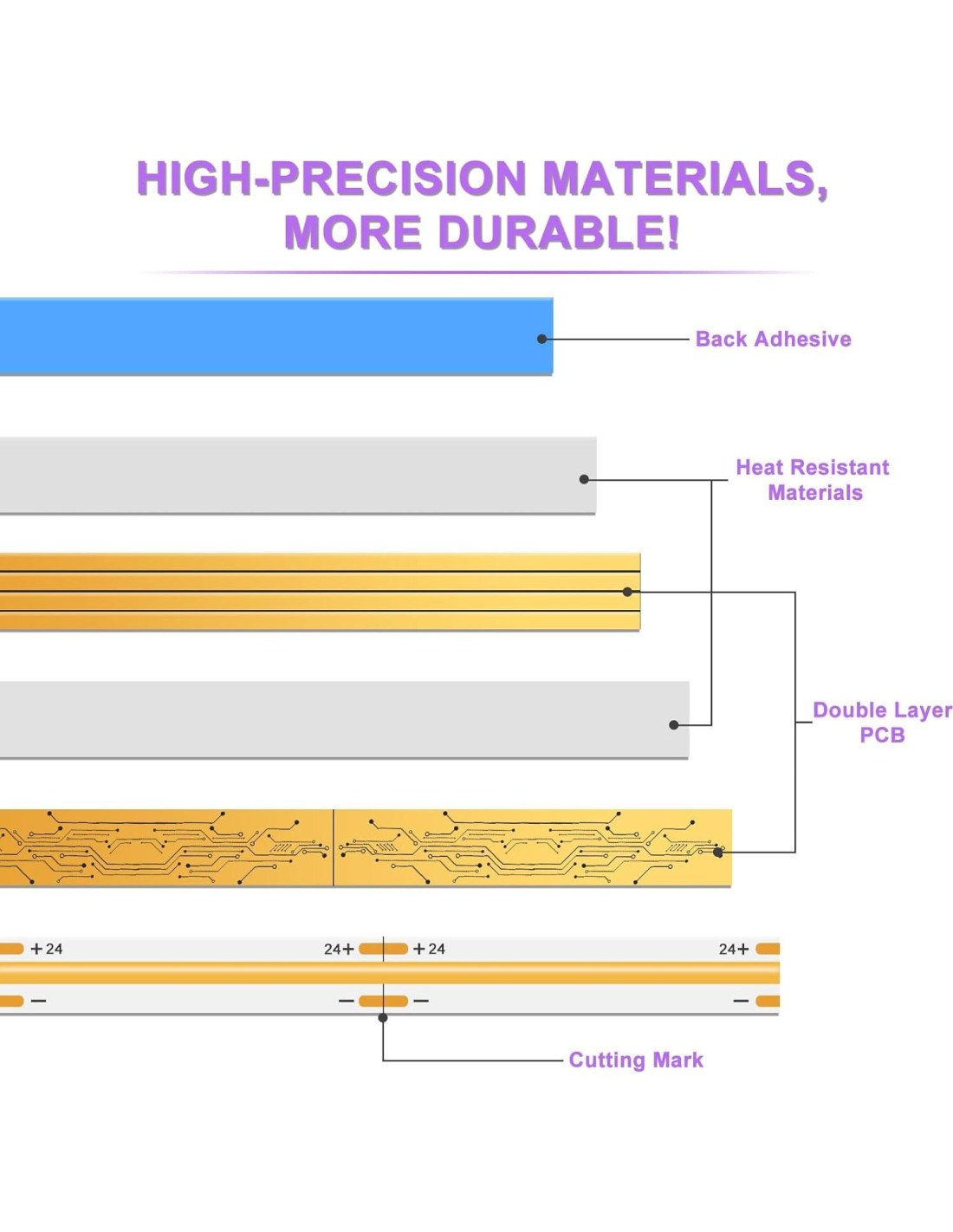 - Alta Calidad: El diseño de la PCB de cobre puro de doble capa no solo proporciona una estabilidad excelente y confiable para la tira de LED COB, sino que también mejora significativamente el efecto de disipación de calor de la tira de luz. ¡El índice de reproducción cromática de hasta 90+ proporciona un efecto de color más realista para tu espacio! El rendimiento estable de la tira de LED COB de MIWISE proporciona una vida útil de más de 65,000 horas, ¡lo que satisface completamente tus necesidades!