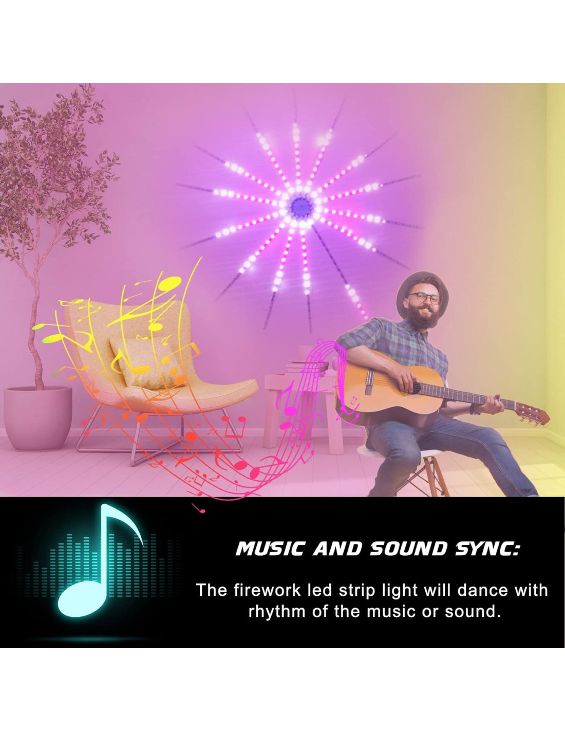 - Seguro y Fácil de Instalar: Las luces de fuegos artificiales son seguras para tu vida con un adaptador de corriente USB listado por UL. No se requieren herramientas adicionales para la instalación. Solo despega la cinta adhesiva en la parte posterior de las luces de tira y pégala, y luego conéctala a la fuente de alimentación para usar.