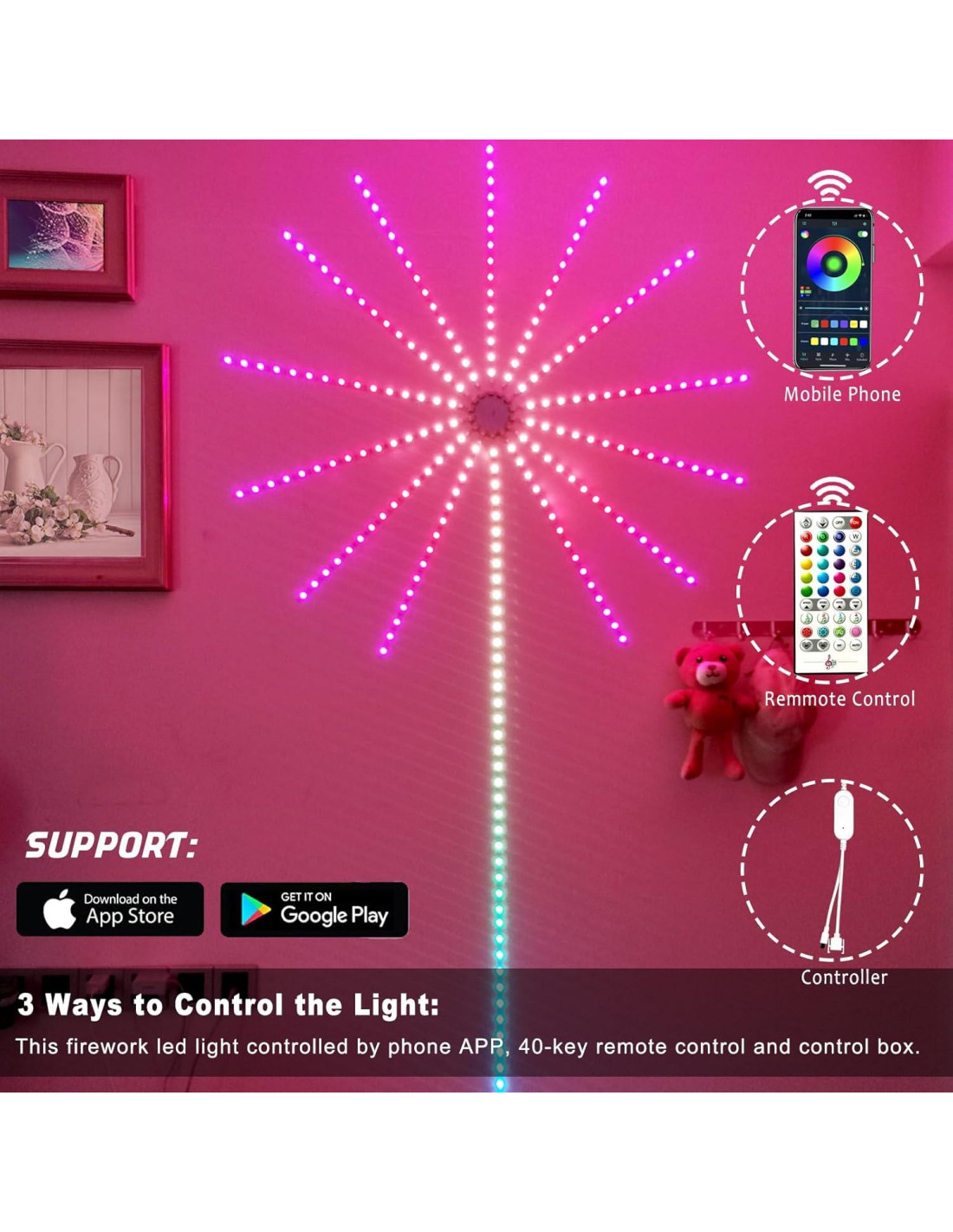 - 14pcs Luces de Tira LED: Las luces de fuegos artificiales se dividen en 13pcs*50cm luces de tira LED cortas y 1pc*150cm luz de tira LED larga. Se controla mediante la APP del teléfono, control remoto de 40 teclas y caja de control.