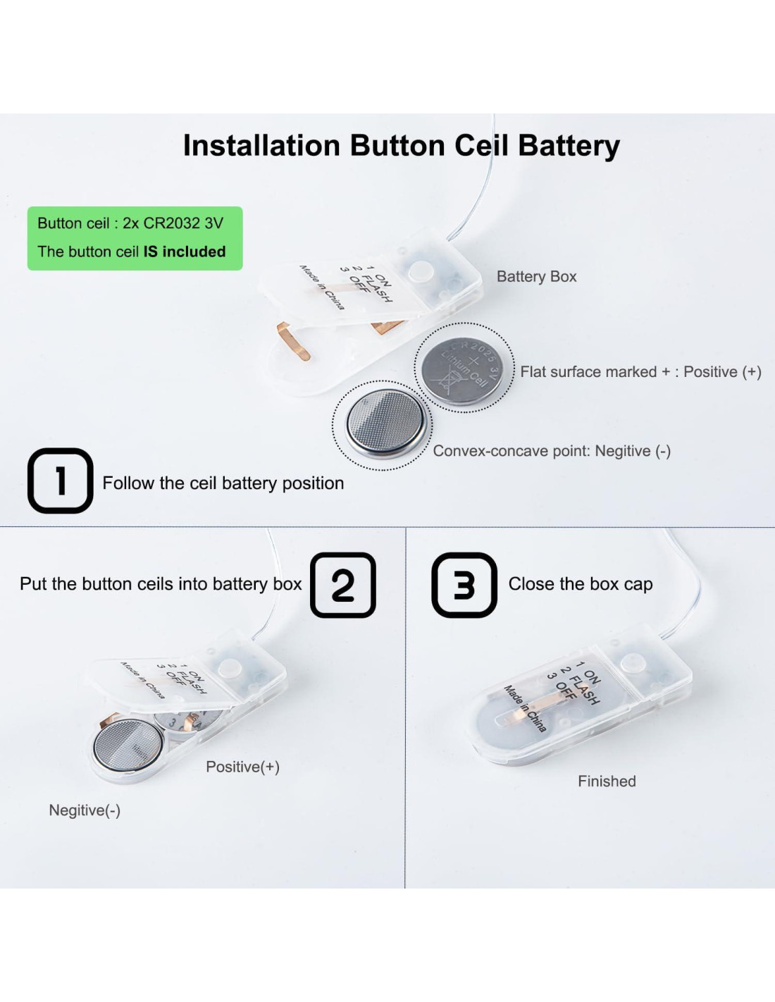 - [ Luces de tira LED a pilas ] Luces de tira LED a pilas con interruptor, la primera pulsación es ENCENDIDO, la segunda pulsación es PARPADEO y la tercera pulsación es APAGADO, no son impermeables. Funciona con batería CR2032.