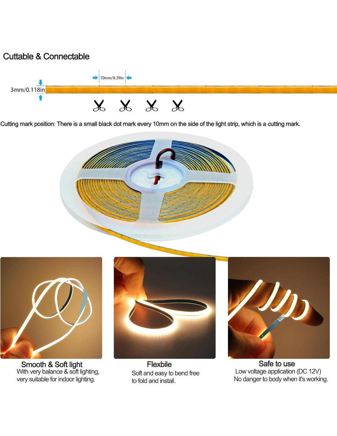 - Aplicación: luces de tira LED COB de 5 V, ultra estrechas, 3 mm de ancho, Blanca Cálida 3000K, 400 LEDs/M total 2000 LEDs, 16.4ft (5m) para dormitorio, comedor, cocina, luz de fondo, jardín, iluminación de fiesta, ahorro de energía y seguro de usar.