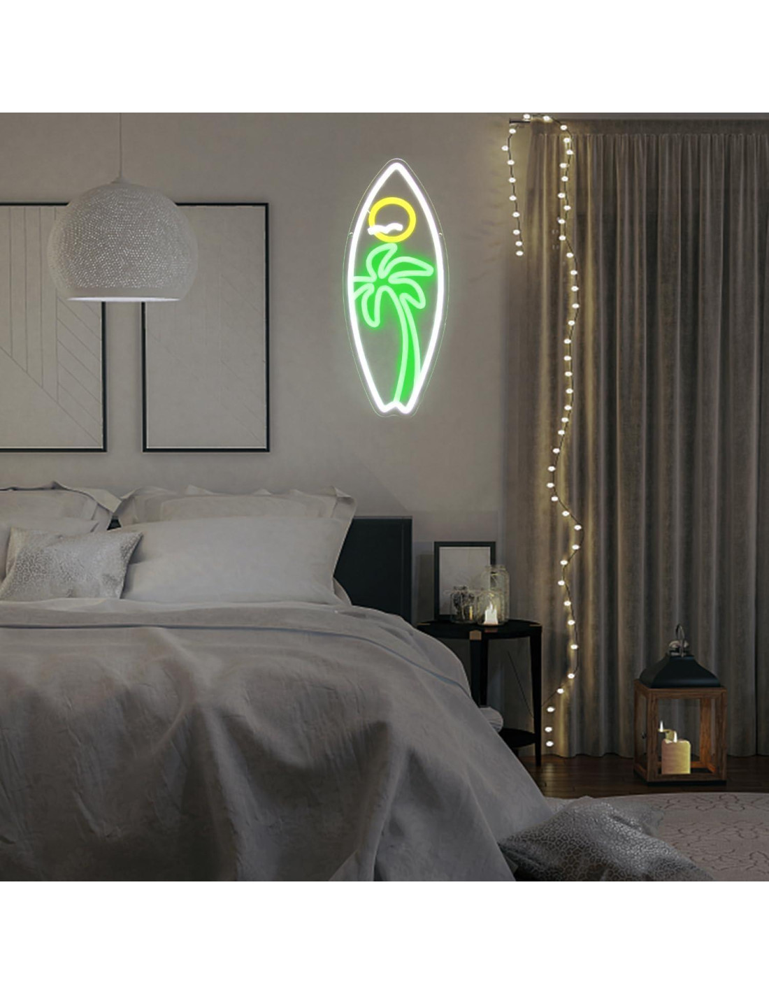 - Genial Luz de Neón de Tabla de Surf - Esta luz de neón está inspirada en una tabla de surf con palma, sol y gaviota, que tiene una rica combinación de colores y un diseño interesante. Si también te gusta el surf o la playa, iluminar un letrero de neón de paisaje tropical puede agregar una atmósfera veraniega y artística.