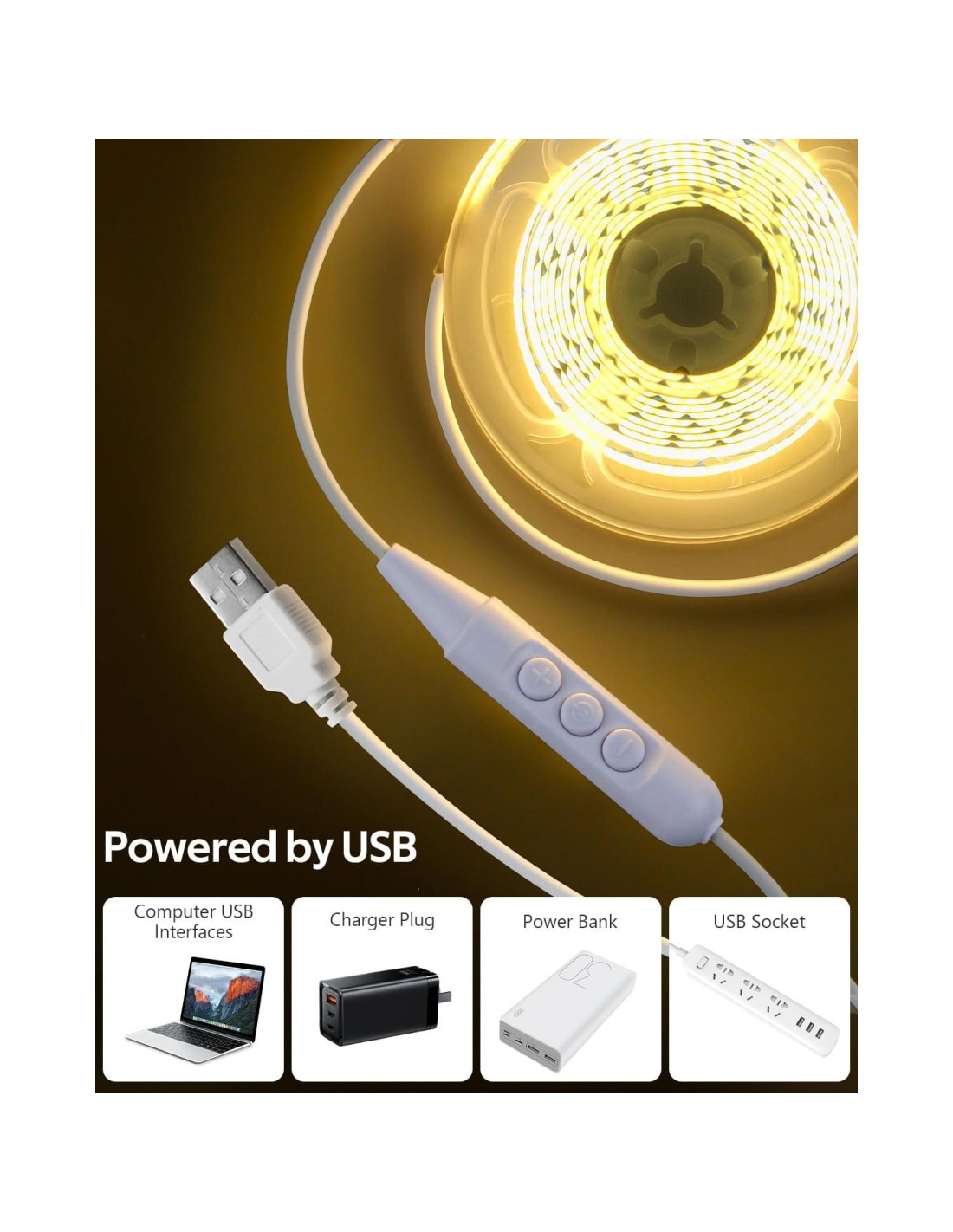 - Conveniente y Fácil de Instalar: Con un cable de alimentación USB de 1.5m para tu uso diario en cualquier lugar. Y la tira de LED COB de 5V se puede conectar directamente a cualquier dispositivo con un puerto USB que emita 5V/2A o más, aumentando enormemente tu comodidad.
