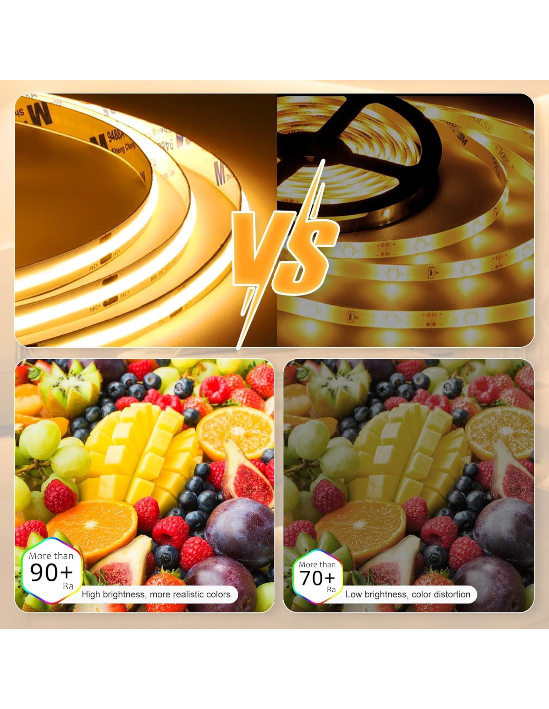 - Luz uniforme ultra brillante: 1 rollo de 10m/3240 3000K tira de luz LED COB regulable puede proporcionar mayor brillo y luz lineal continua. CRI>90 los colores son ricos y la restauración es fuerte. La cubierta de la tira de luz de material de silicona amarilla inodora y segura hace que las tiras de luz sean más uniformes y brillantes, cómodas y suaves.